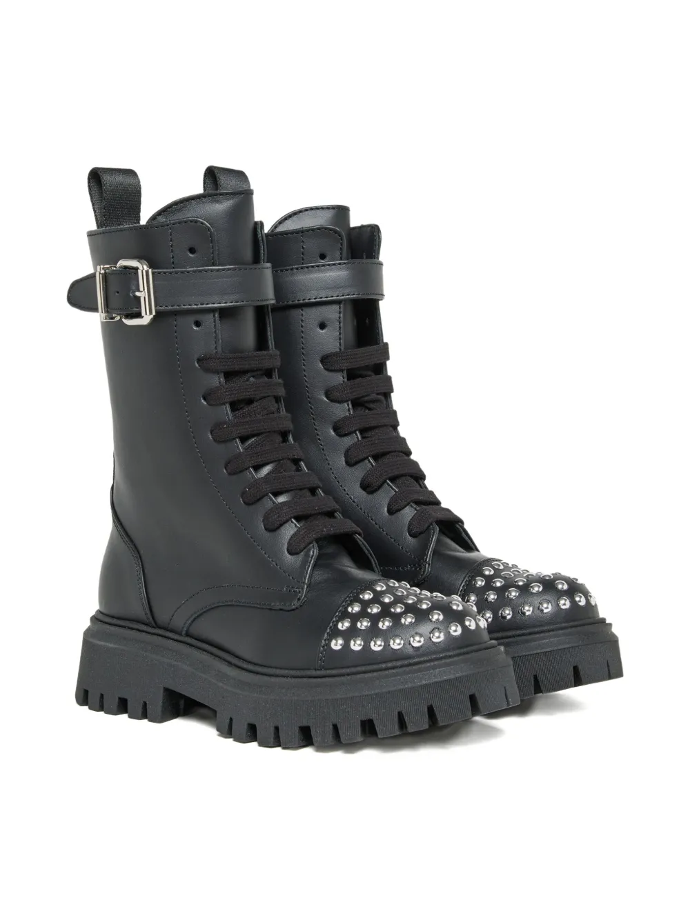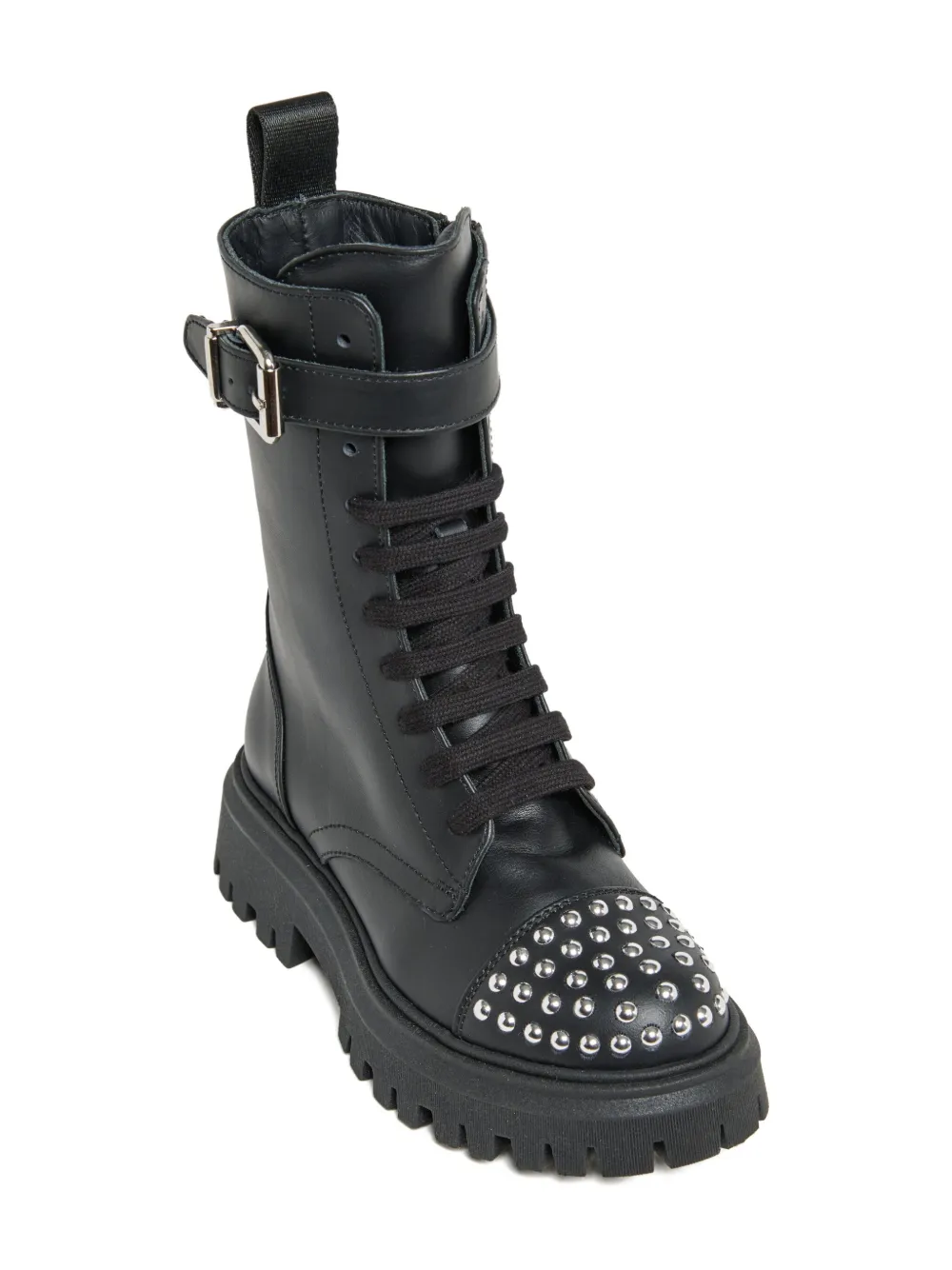 Черная телячья кожа, шнуровка, застежка на пряжку, заклепочный носок