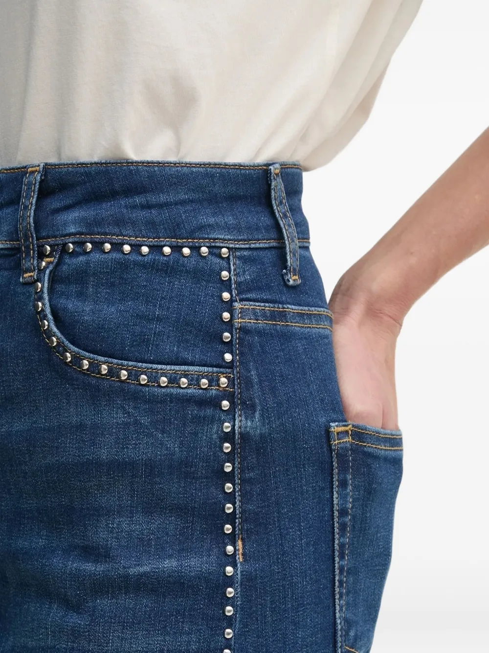 Темно-синие заклепки, высокая талия, разрез сзади, необработанный край, застежка на пуговицы.