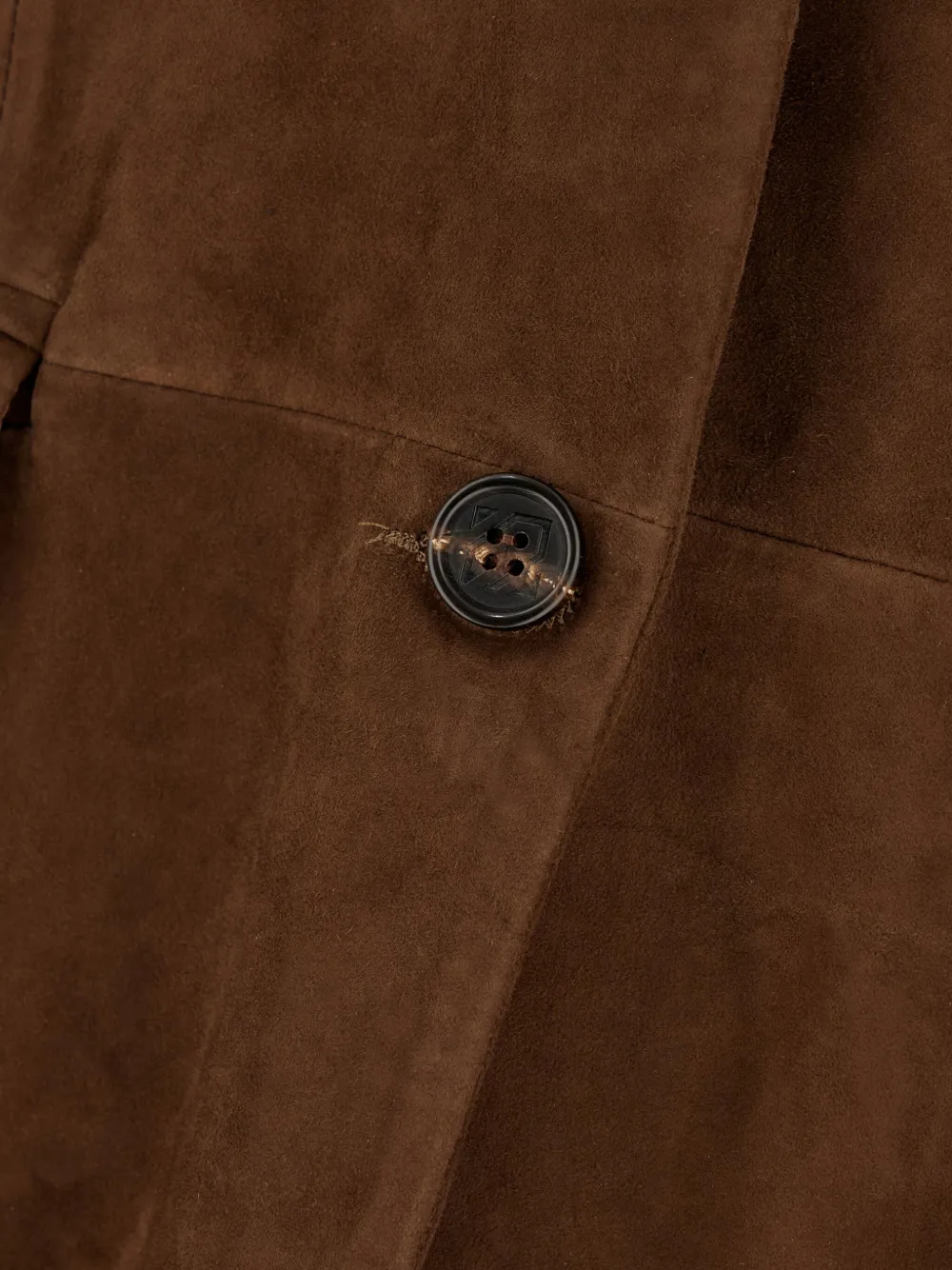 Коричневая замша, застежка на пуговицы, отвороты с клапанами, карманы с длинными рукавами