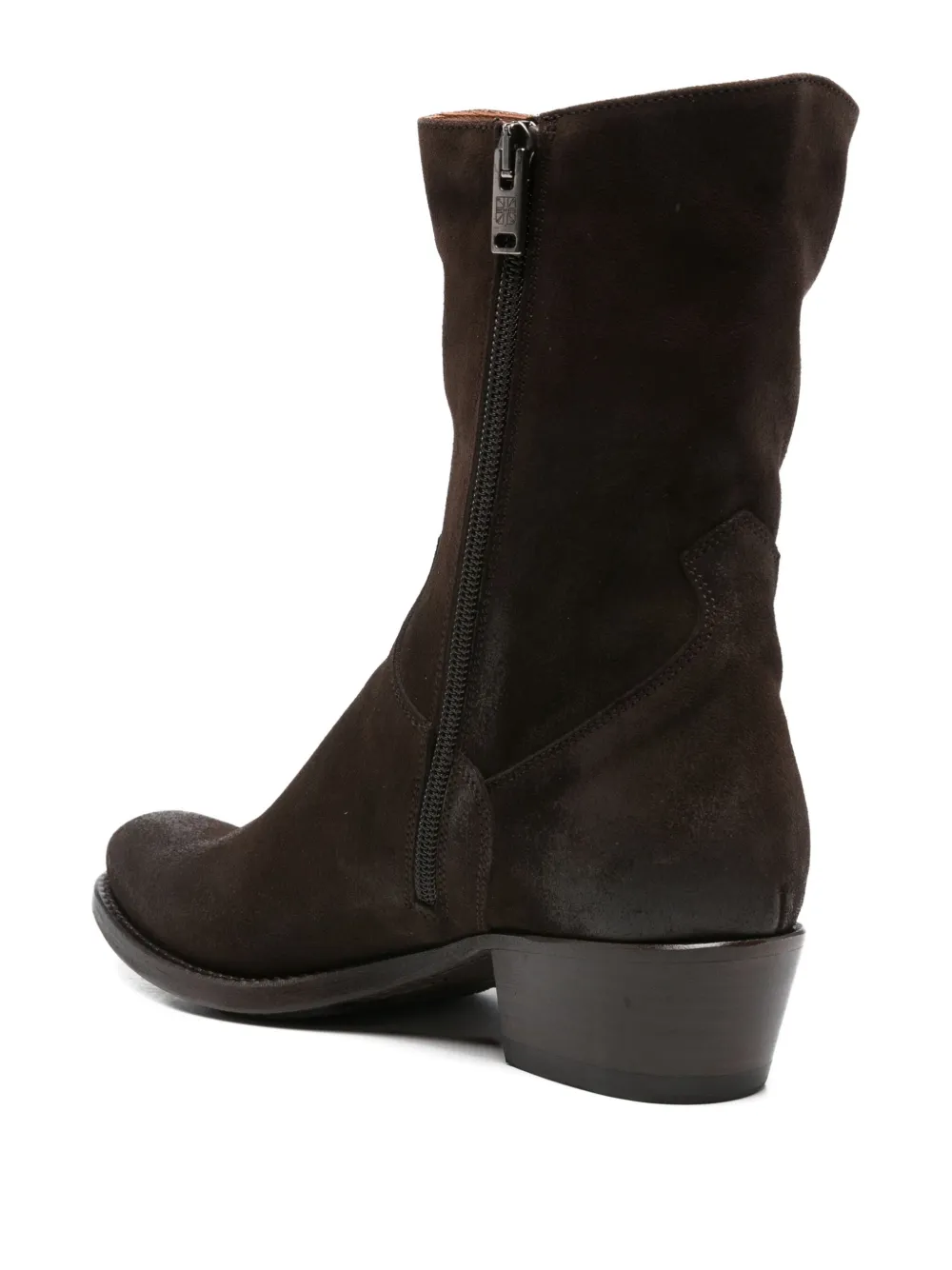 Верх из темно-коричневой замши, застежка-молния сбоку, кубинский каблук, миндалевидный носок.