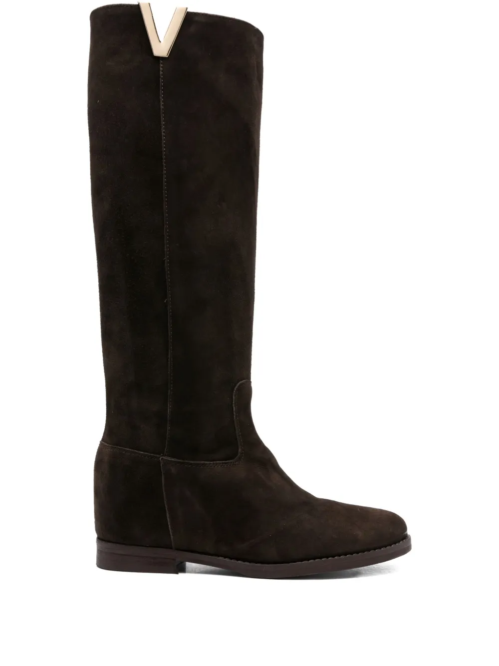 Верх из темно-коричневой замши, плоская подошва, голенище до колена, круглый носок