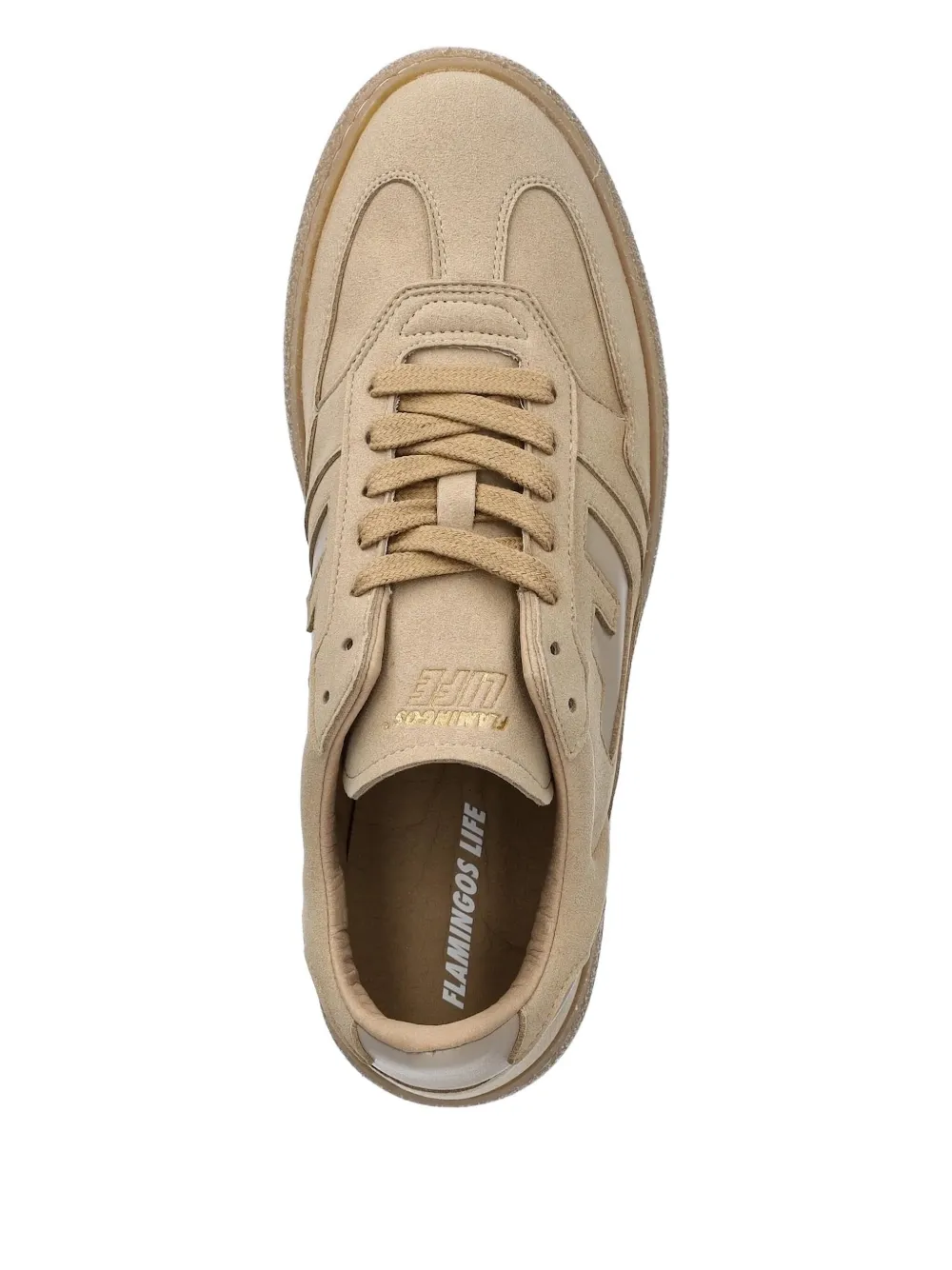 Верх из бежевой замши, кожаная вставка на пятке, плоские шнурки, резиновая подошва, волнистый рисунок на подошве.