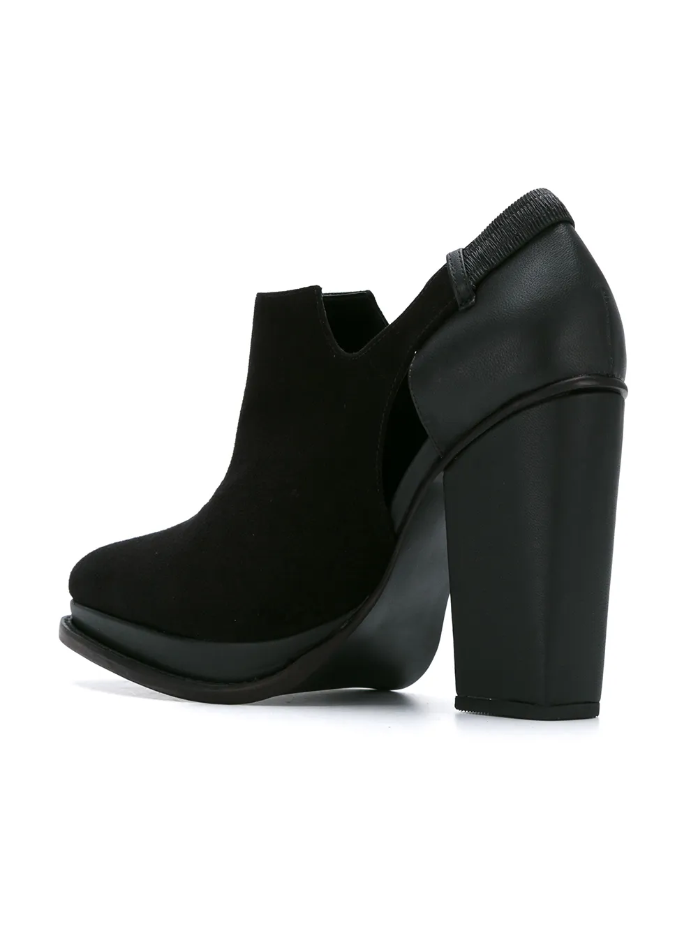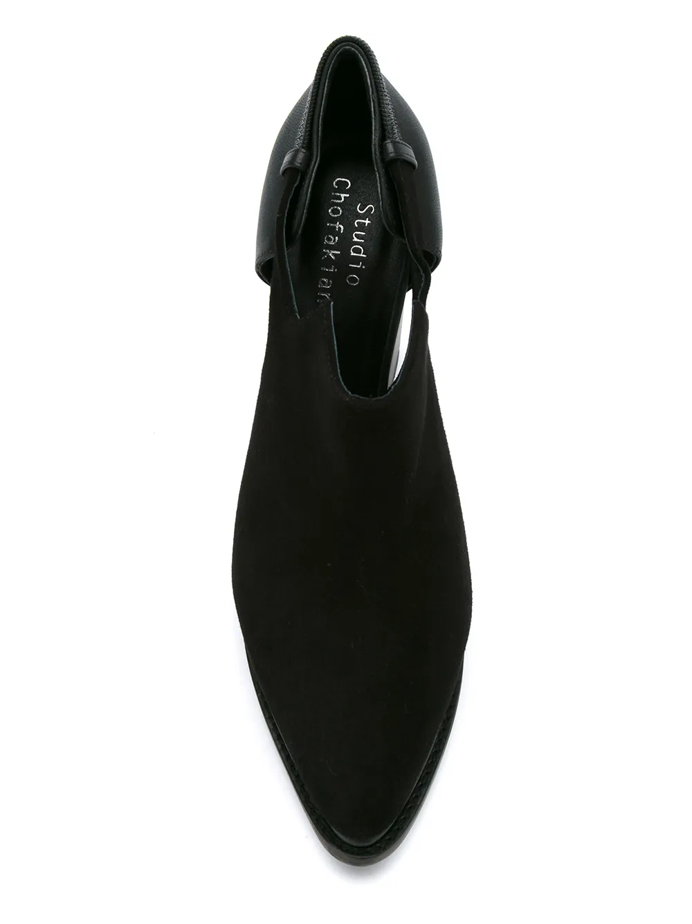 Suede open boots от Studio Chofakian. Заостренный носок, резная деталь, эластичные боковые панели и массивный высокий каблук. Цвет: черный.