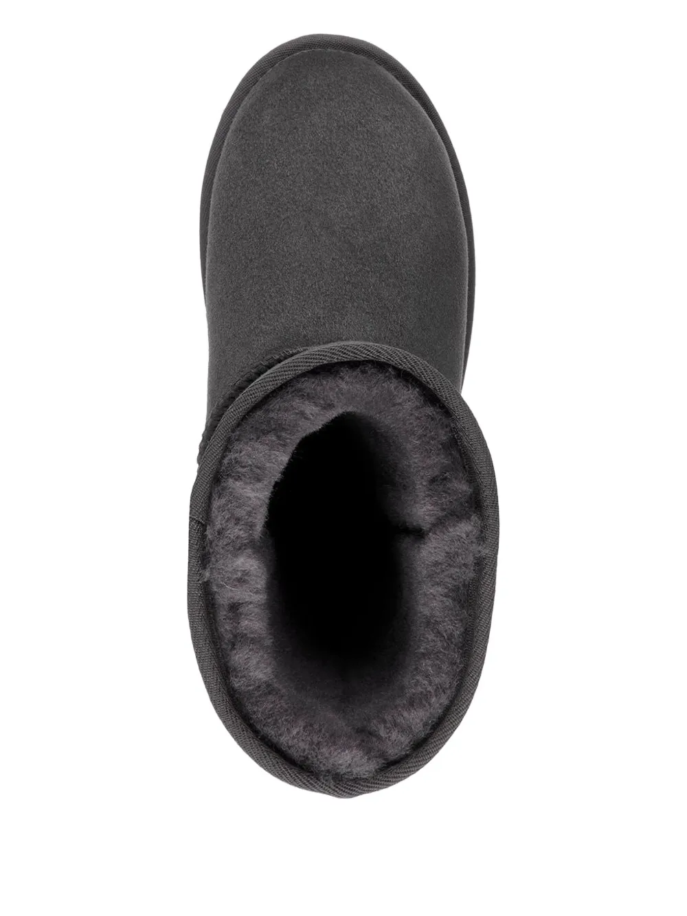 Верх из серой замши, подкладка из мериносовой шерсти, плоская резиновая подошва, круглый носок.