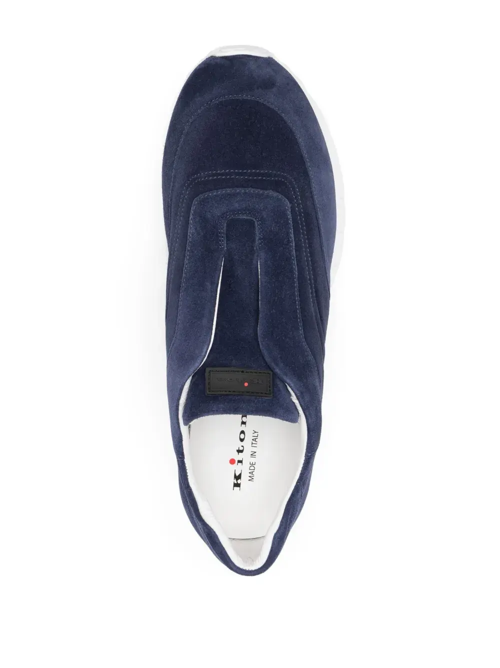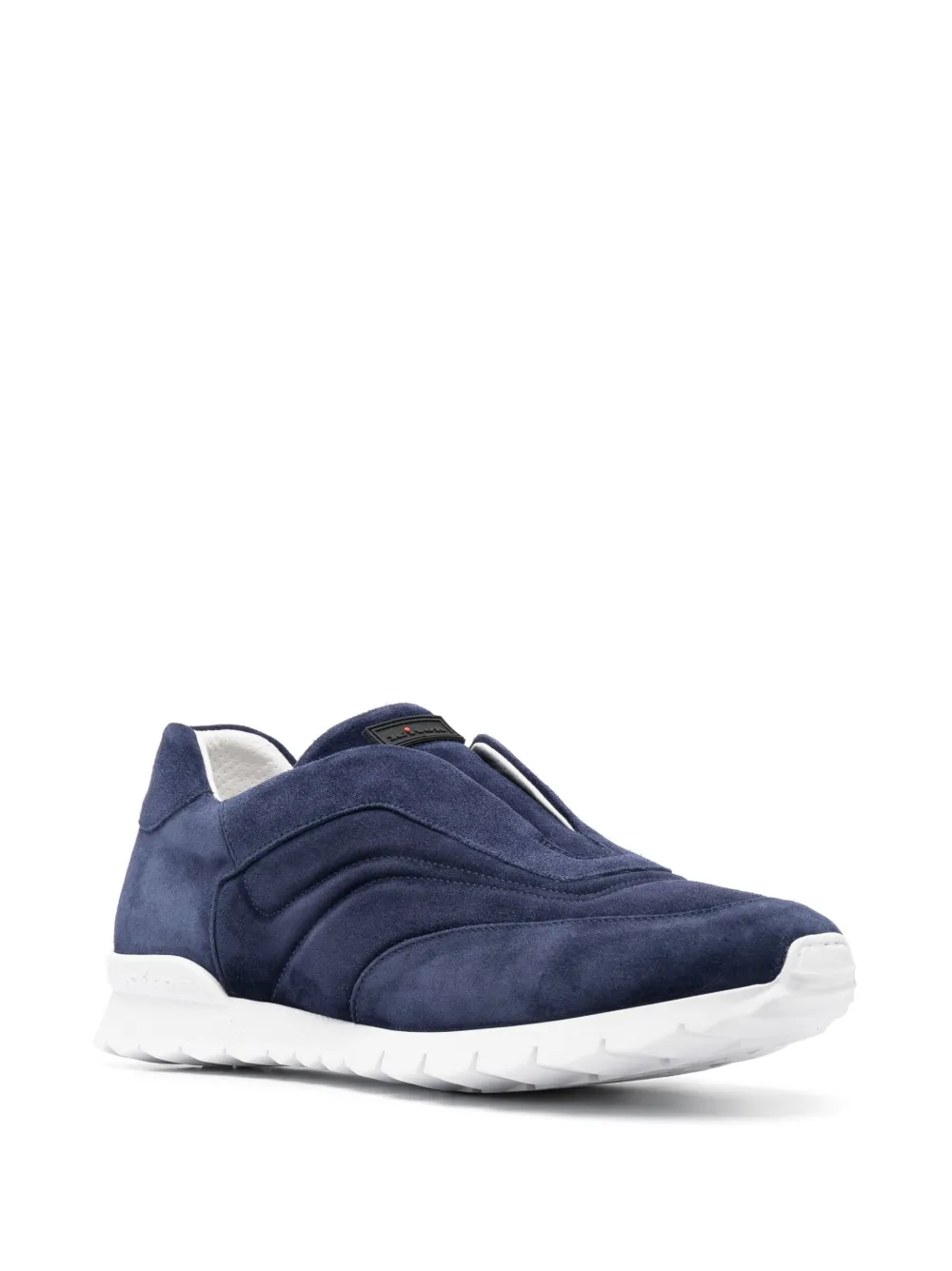 Темно-синий, замша из телячьей кожи, телячья кожа, нашивка с логотипом на язычке, кожаная стелька с логотипом, закругленный носок, модель без застежки и рифленая резиновая подошва.
