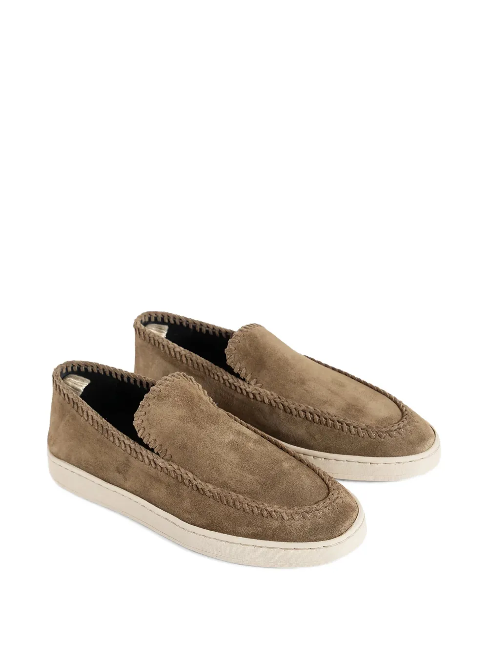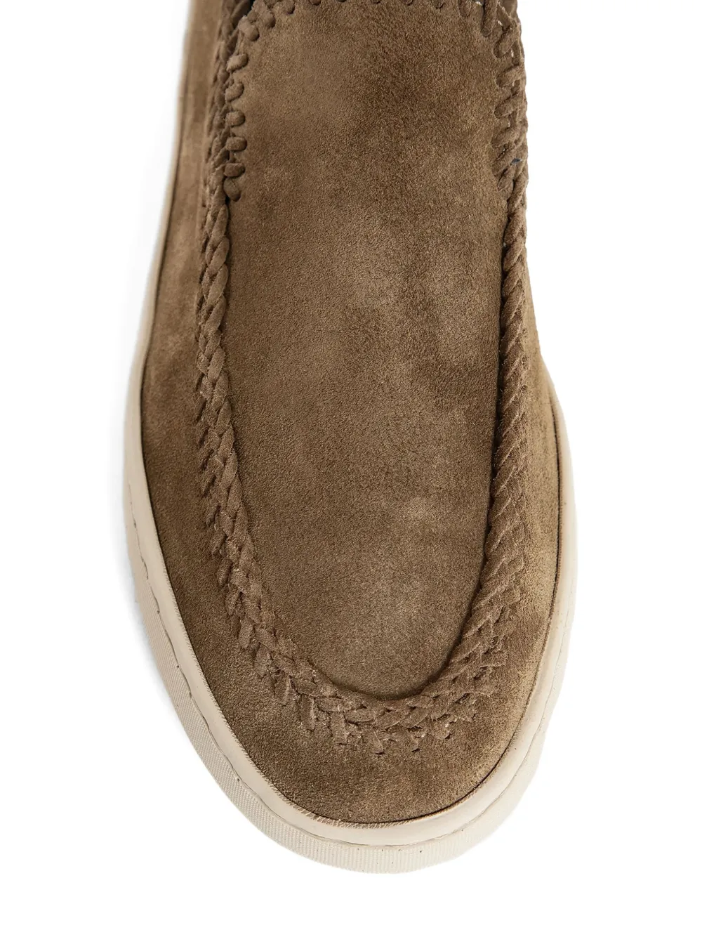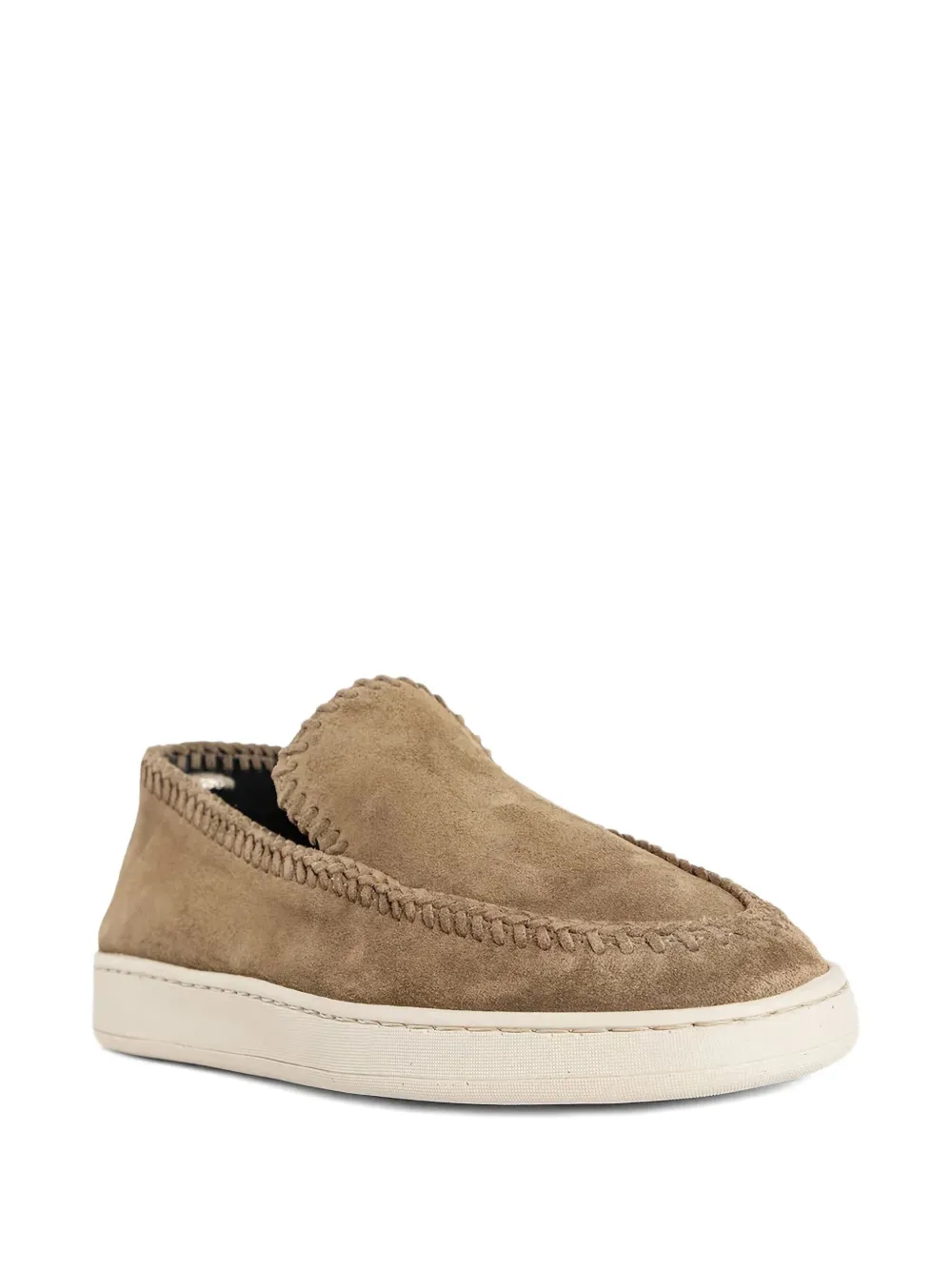 Верх из бежевой замши, прошитые детали, круглый носок, плоская подошва, модель slip-on