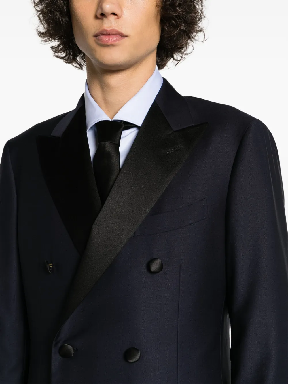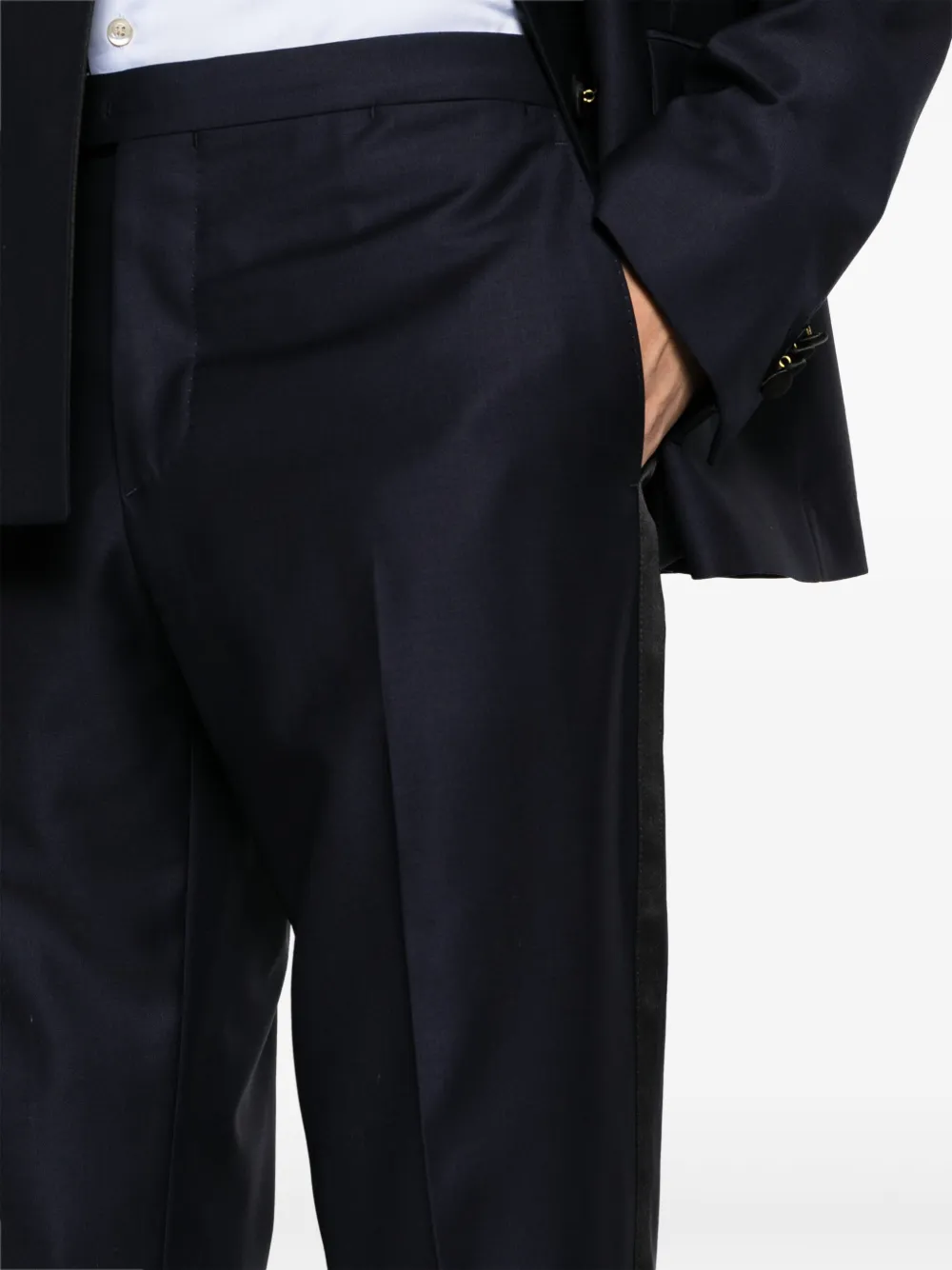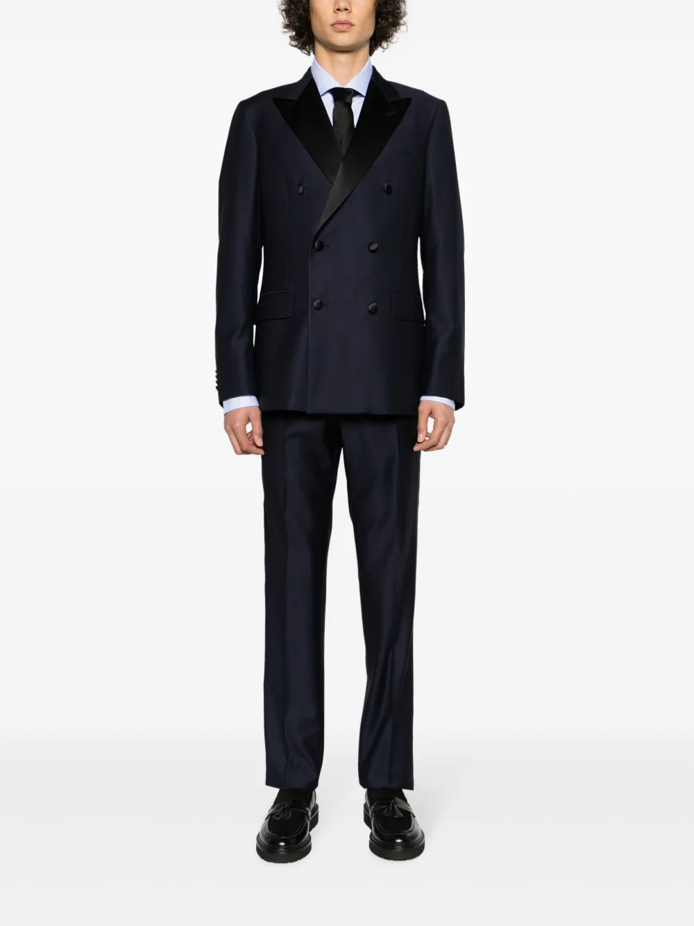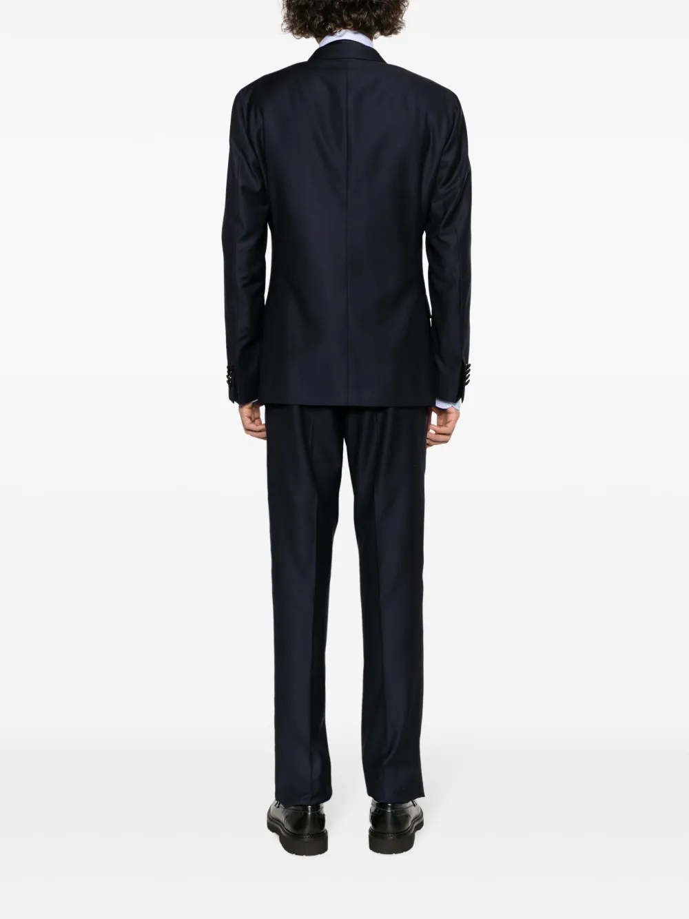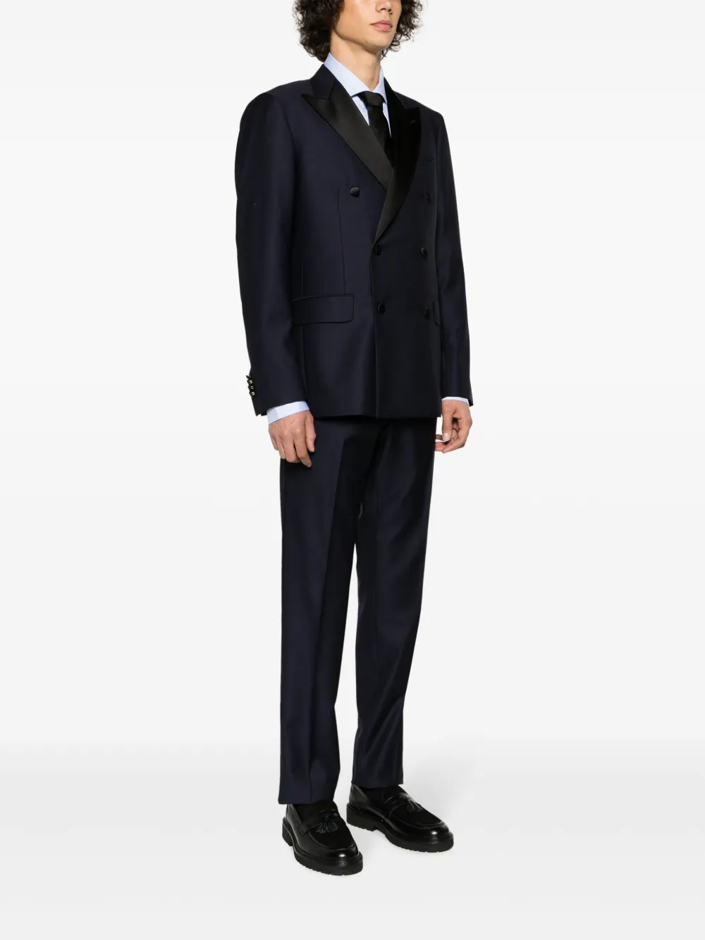 Смесовая необработанная шерсть, атласная отделка, обтянутые тканью пуговицы, заостренные лацканы, двубортная застежка на кнопки, манжеты на пуговицах, прорезной карман на груди, два передних кармана с клапанами, две боковые шлицы сзади, цельная подкладка, стрелки, прямой крой, ширинка на молнии, два вшитых кармана по бокам и два прорезных кармана сзади.