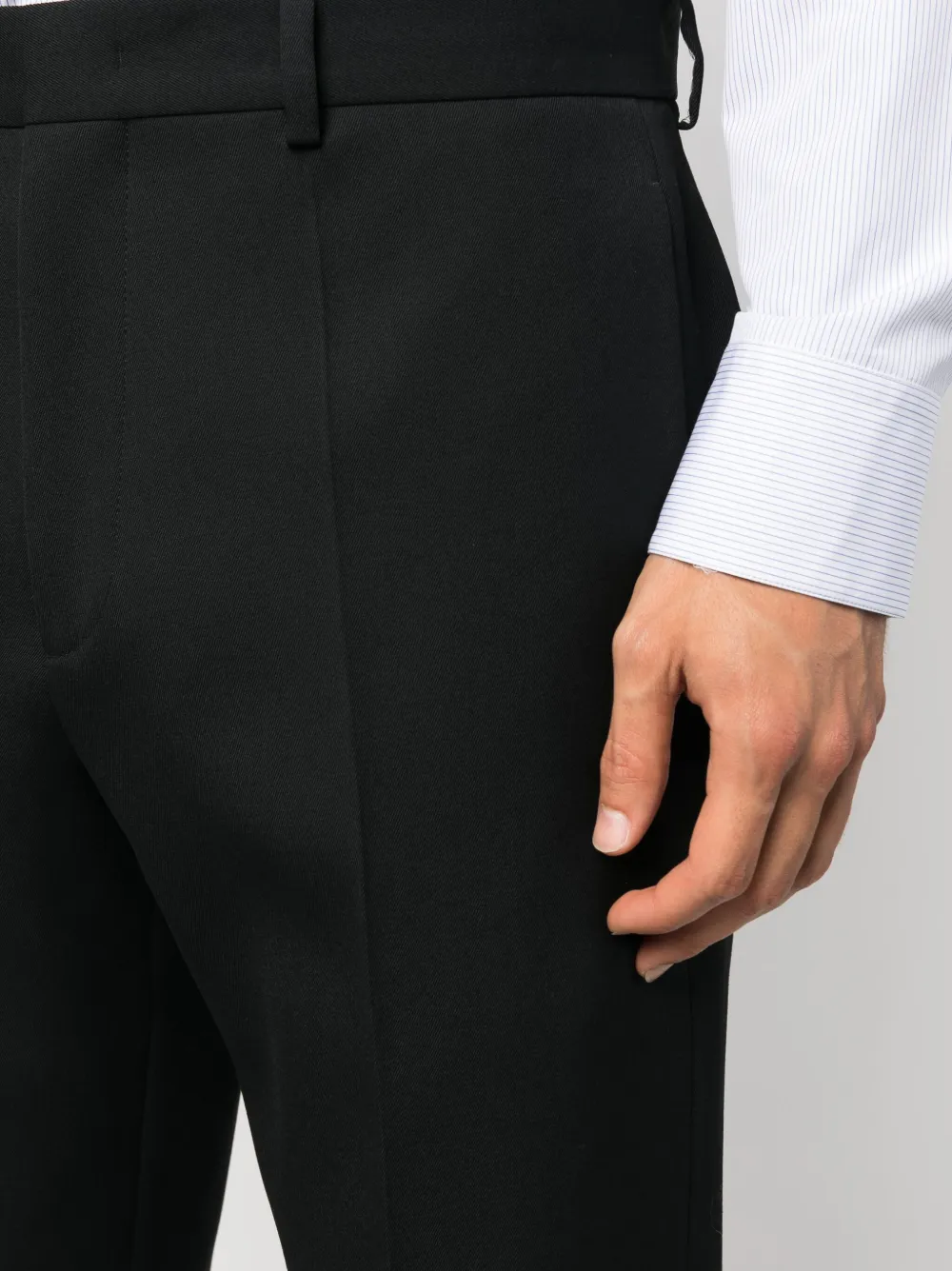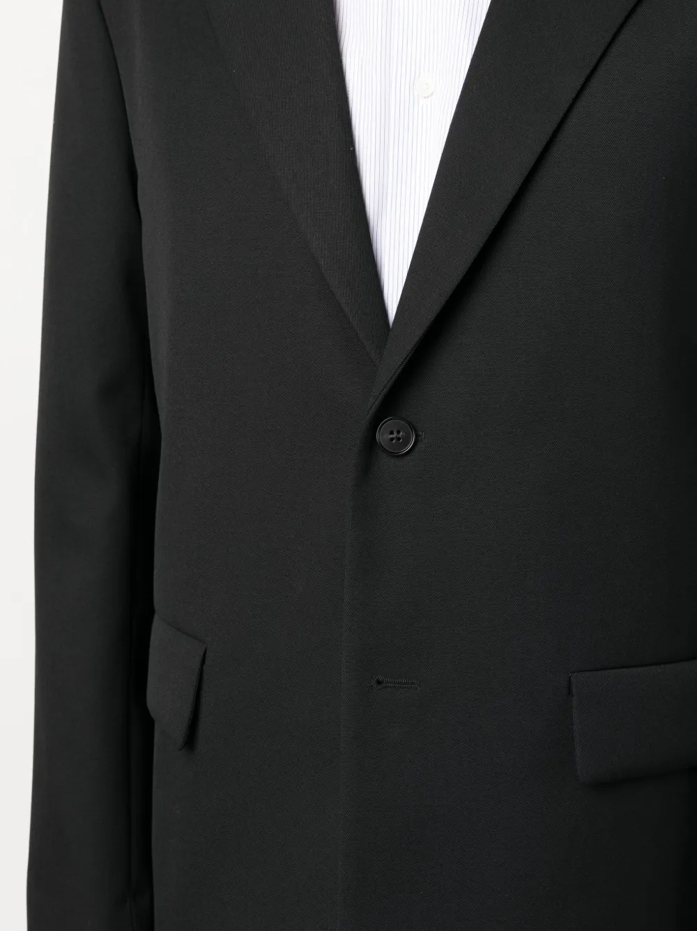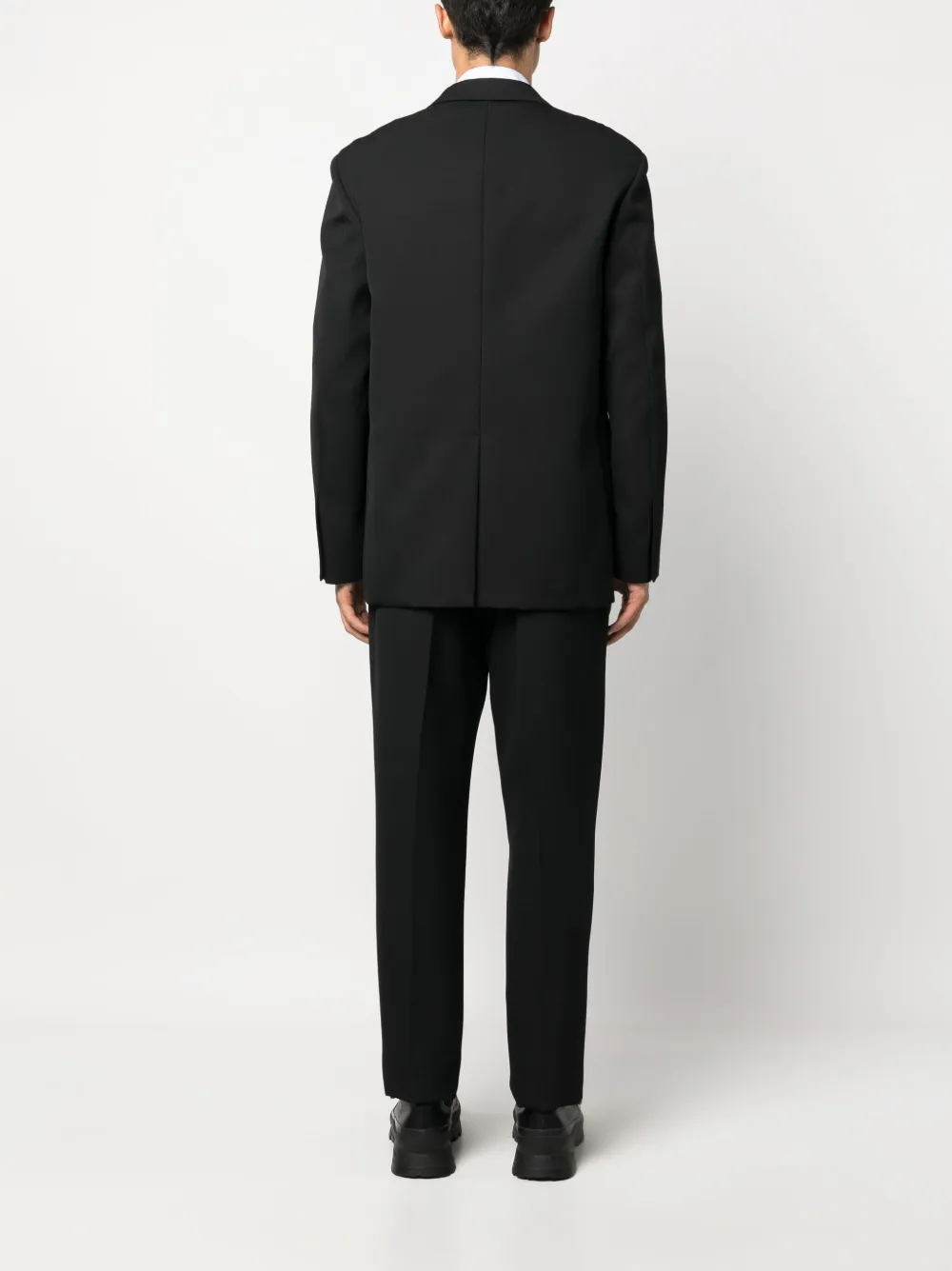 Черный, зазубренные лацканы, застежка на пуговицах спереди, длинные рукава, манжеты с разрезами, два кармана с клапанами по бокам, шлица по центру сзади, стрелки, петли для ремня, потайная застежка спереди, прямой крой, два вшитых кармана по бокам и два прорезных кармана сзади.
