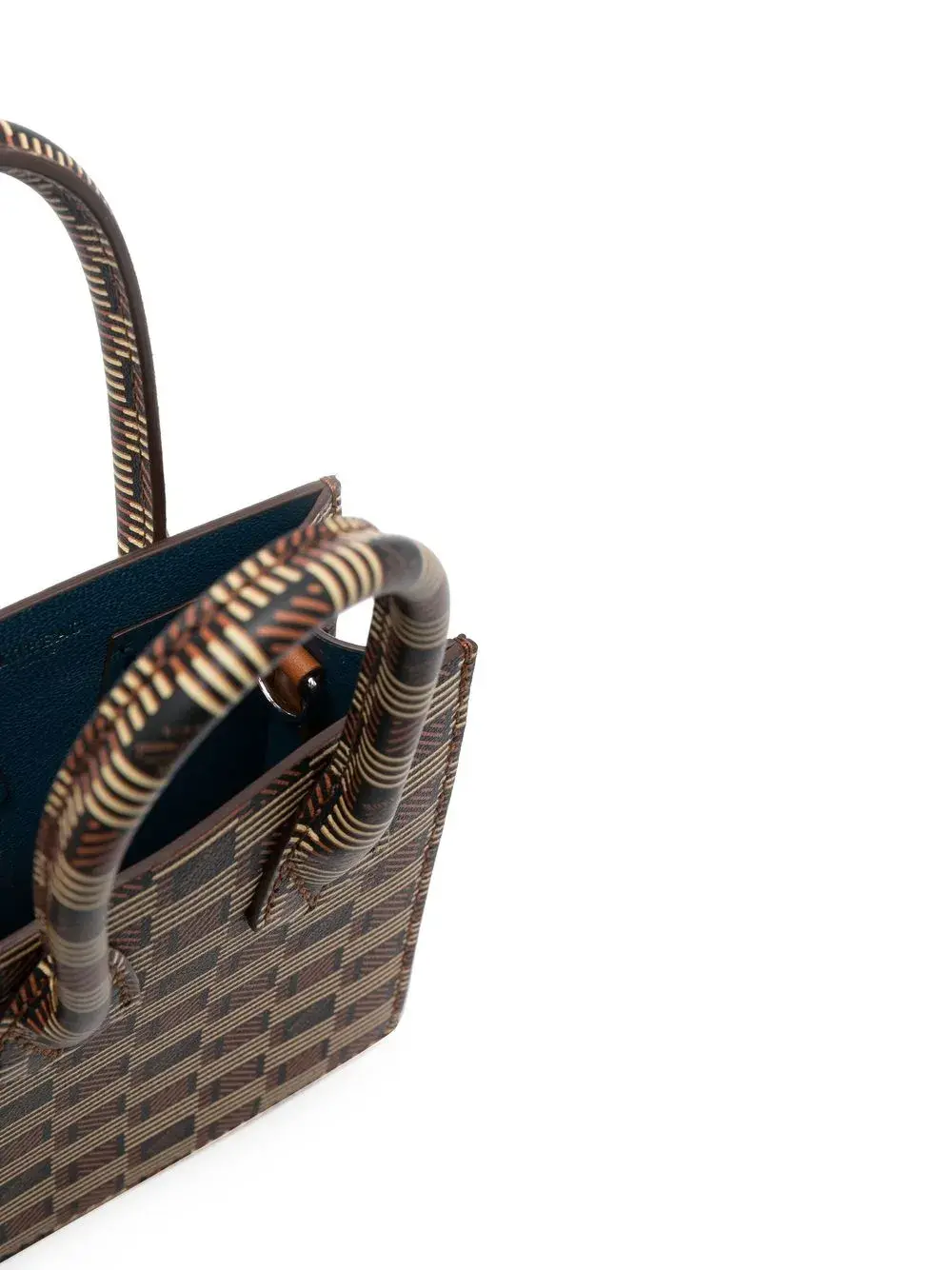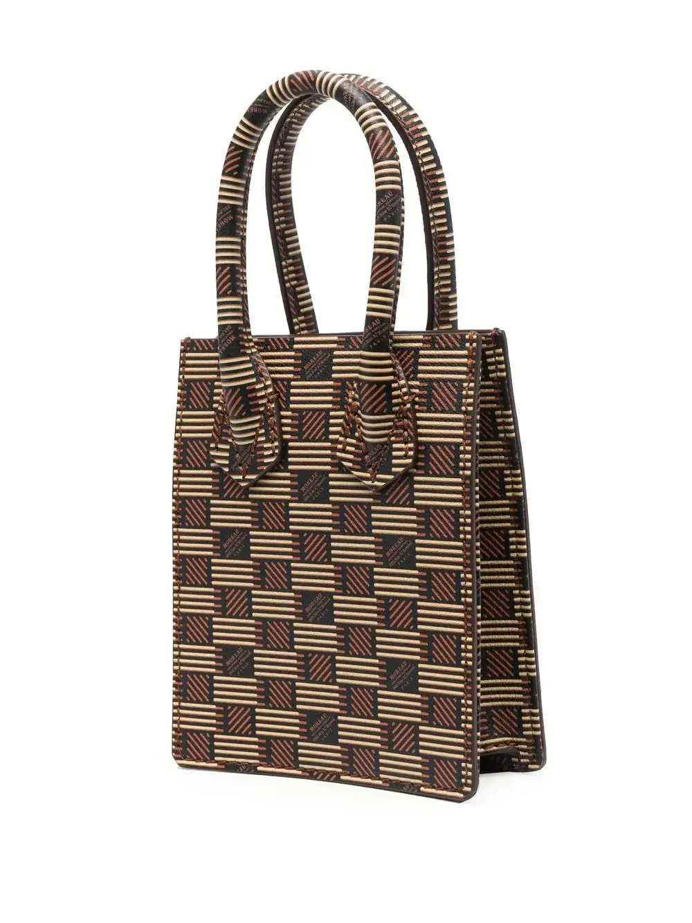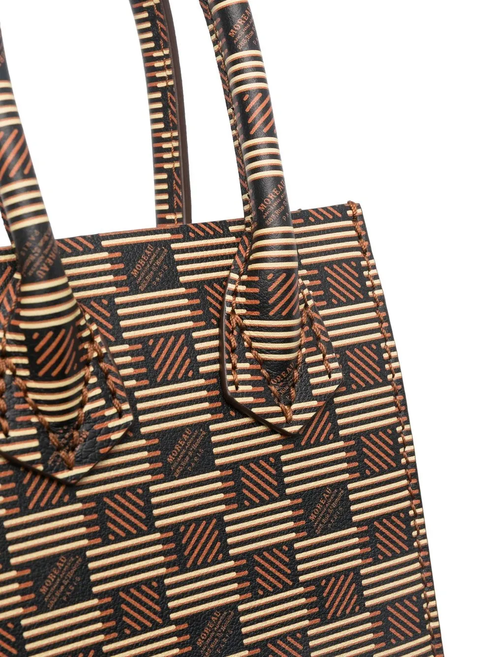 Расцветка Tobacco Brown, телячья кожа, сплошной графичный принт, две плоские верхние ручки, съемный ремень на плечо и основное отделение.