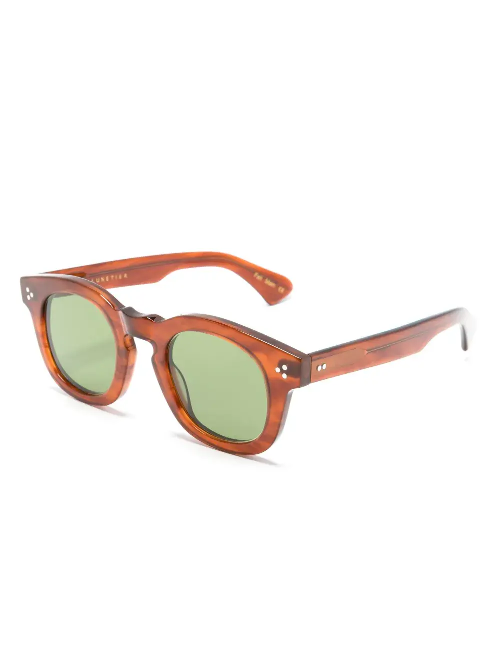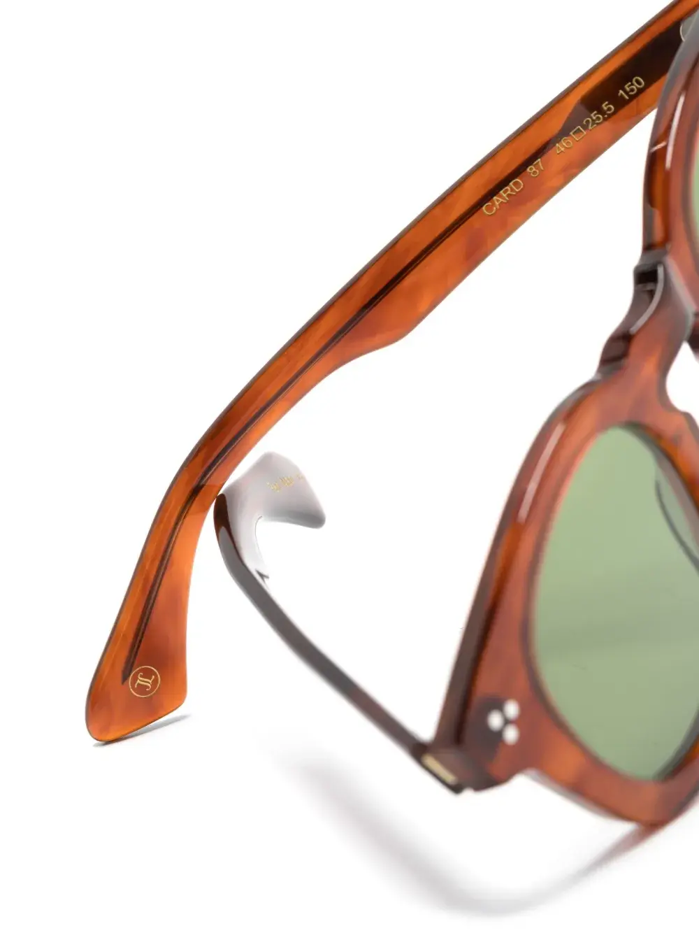 Коричневый, ацетат, круглая оправа, затемненные линзы зеленого цвета, логотип на дужке, прямые дужки и дужки с закругленными концами. Обратите внимание, что на FARFETCH продаются оправы с линзами без диоптрий. В комплект входит защитный чехол для очков.