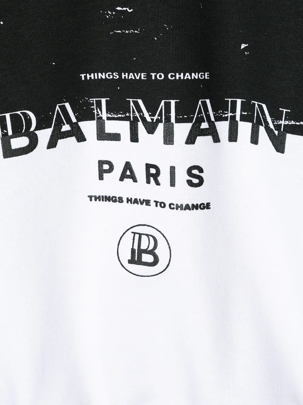 Толстовка Things Have to Change от Balmain Kids. Круглый вырез под горло в рубчик, длинные рукава, принт с логотипом спереди, декоративный слоган, эффект разбрызганной краски и подол и манжеты в рубчик. Цвет: черный.