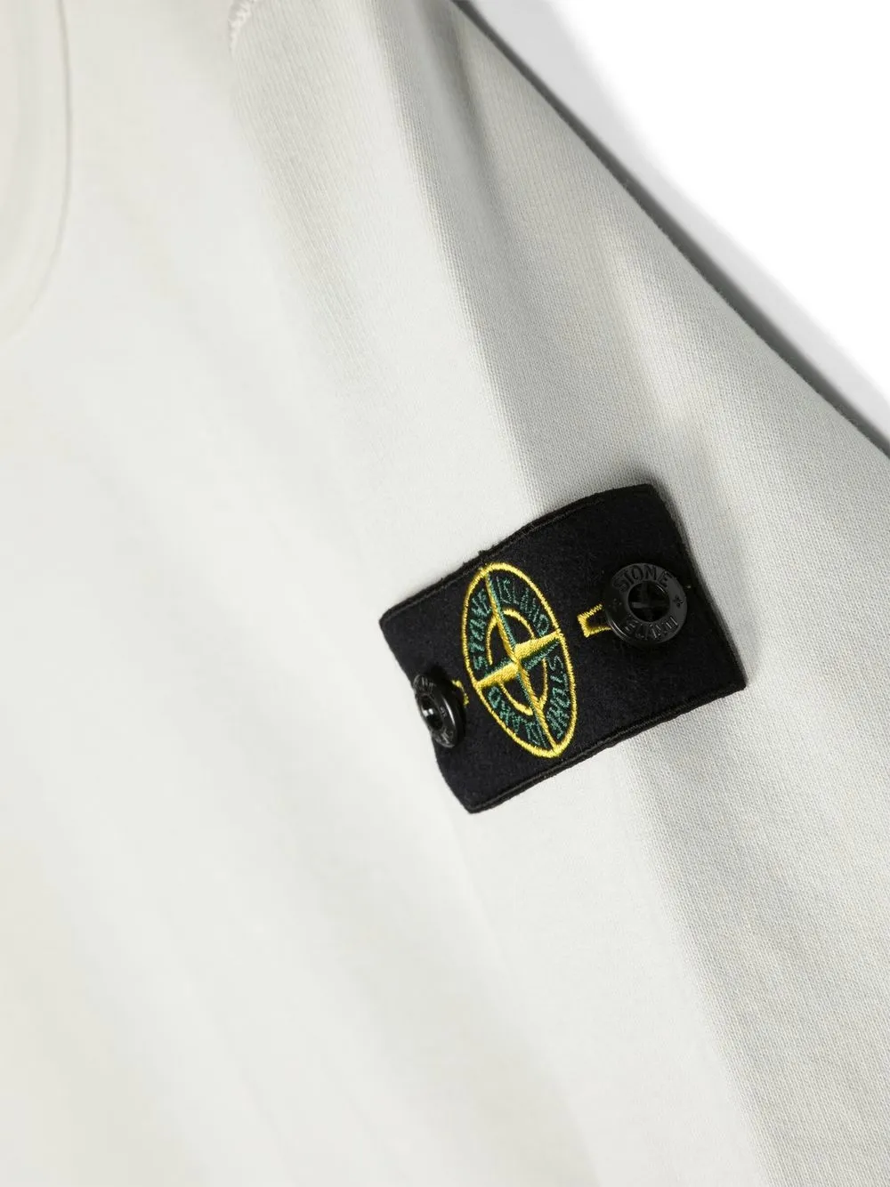 Кремовый, хлопок, знаковая деталь в виде компаса, нашивка с логотипом на рукаве, круглый вырез, длинные рукава и прямой подол.