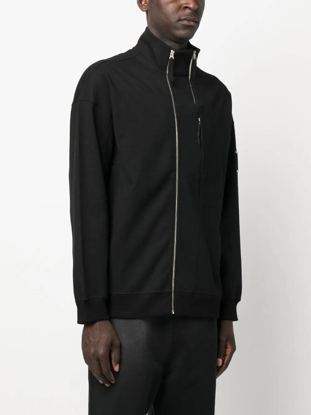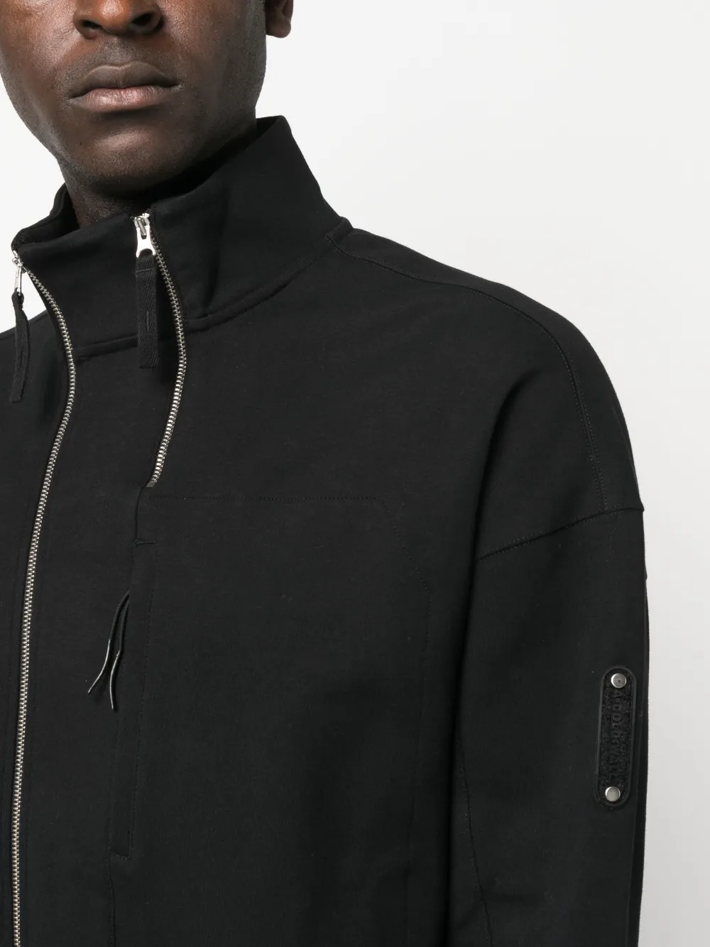 Черный, смесовый хлопок, вышитый логотип спереди, застежка на молнии спереди, отделка с декоративной молнией, нашивка с логотипом на рукаве, приспущенные плечи, длинные рукава и два нагрудных кармана на молнии.
