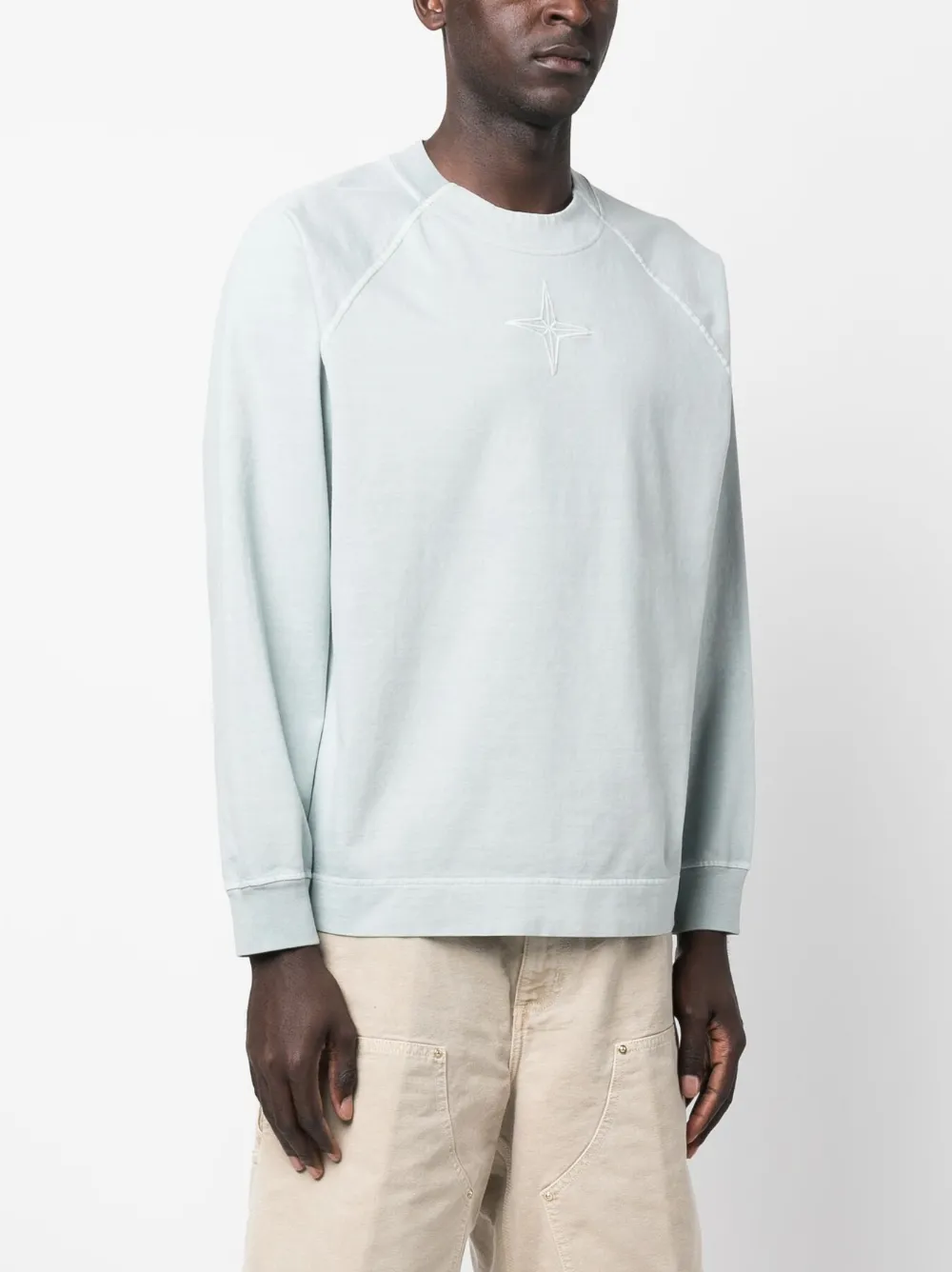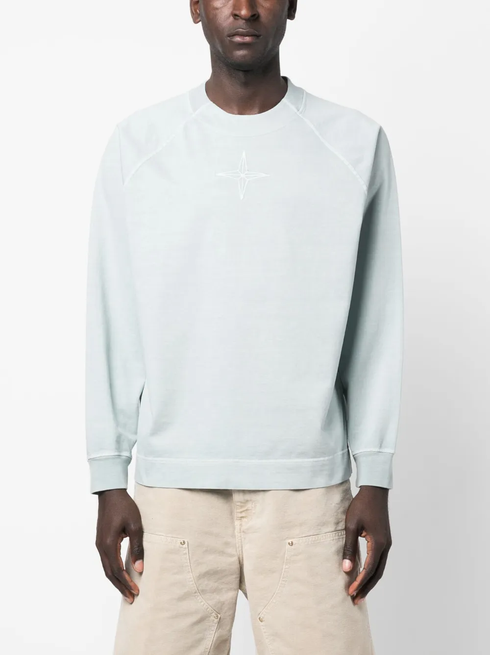 Голубой, хлопок, знаковая деталь в виде компаса, вышитый логотип сзади, круглый вырез, длинные рукава реглан, прямой подол и отделка в рубчик.