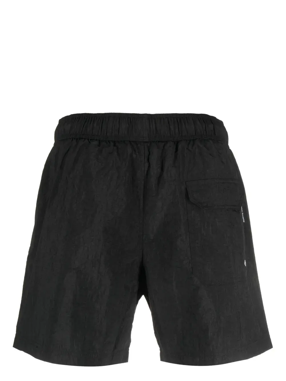 Черный, жатый эффект, нашивка с логотипом спереди, кулиска на талии, два прорезных кармана по бокам и карман с клапаном сзади. Пожалуйста, примеряйте купальники и пляжные шорты только поверх собственного белья.