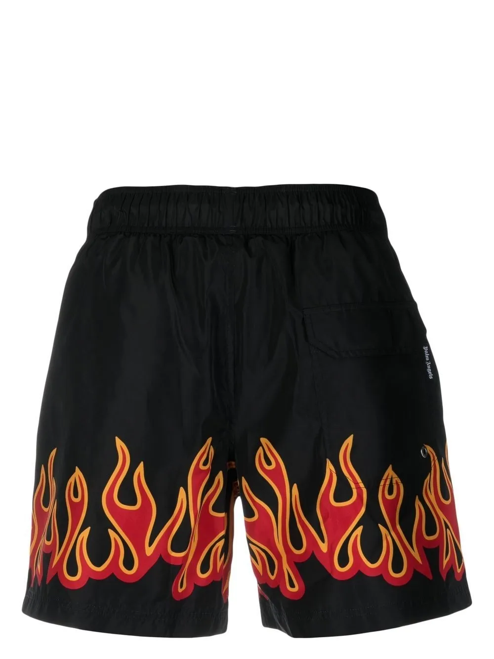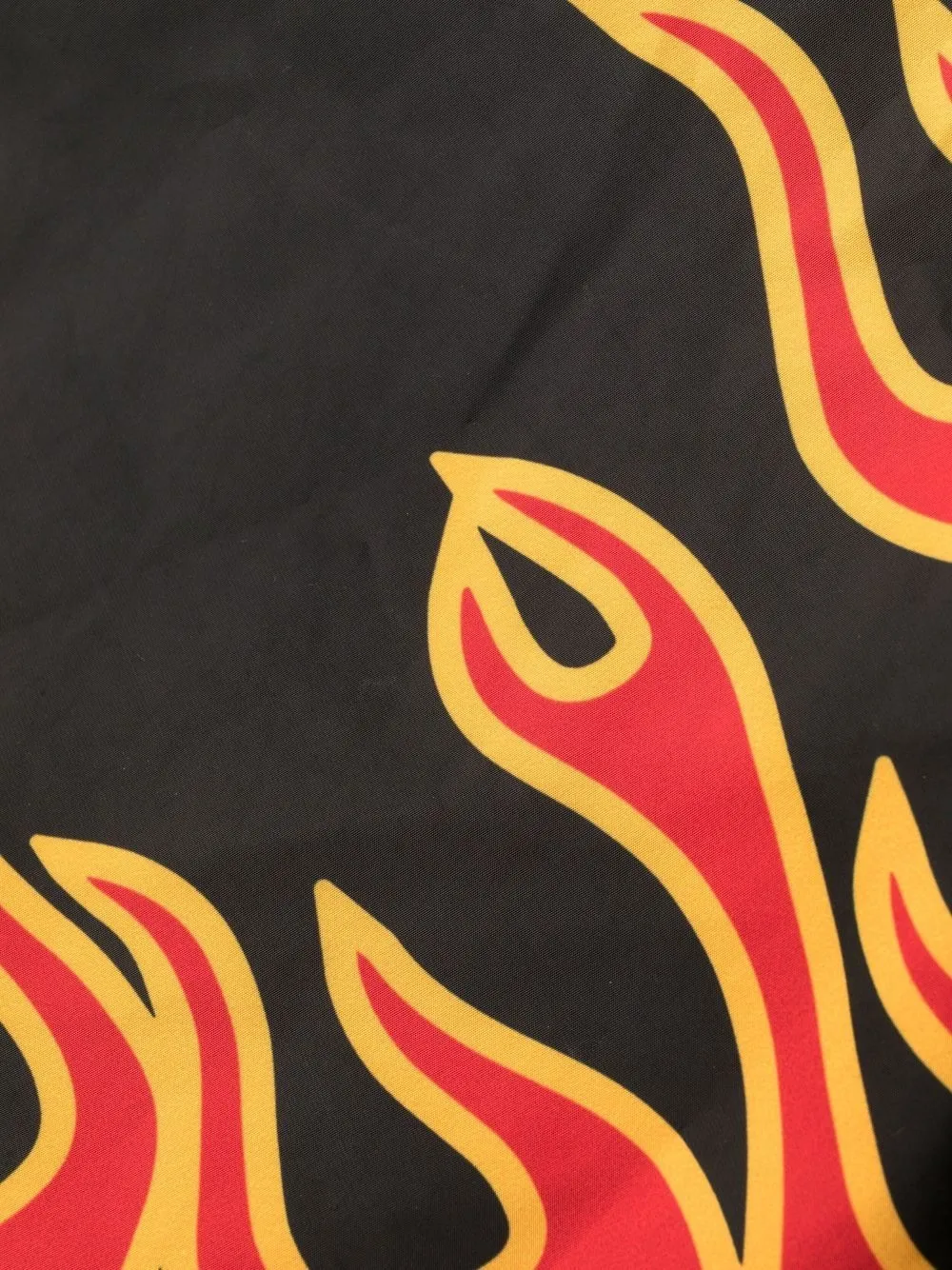 Черный/красный, принт с изображением пламени, эластичный пояс, прорезные карманы по бокам и длина до бедер. Пожалуйста, примеряйте купальники и пляжные шорты только поверх собственного белья.