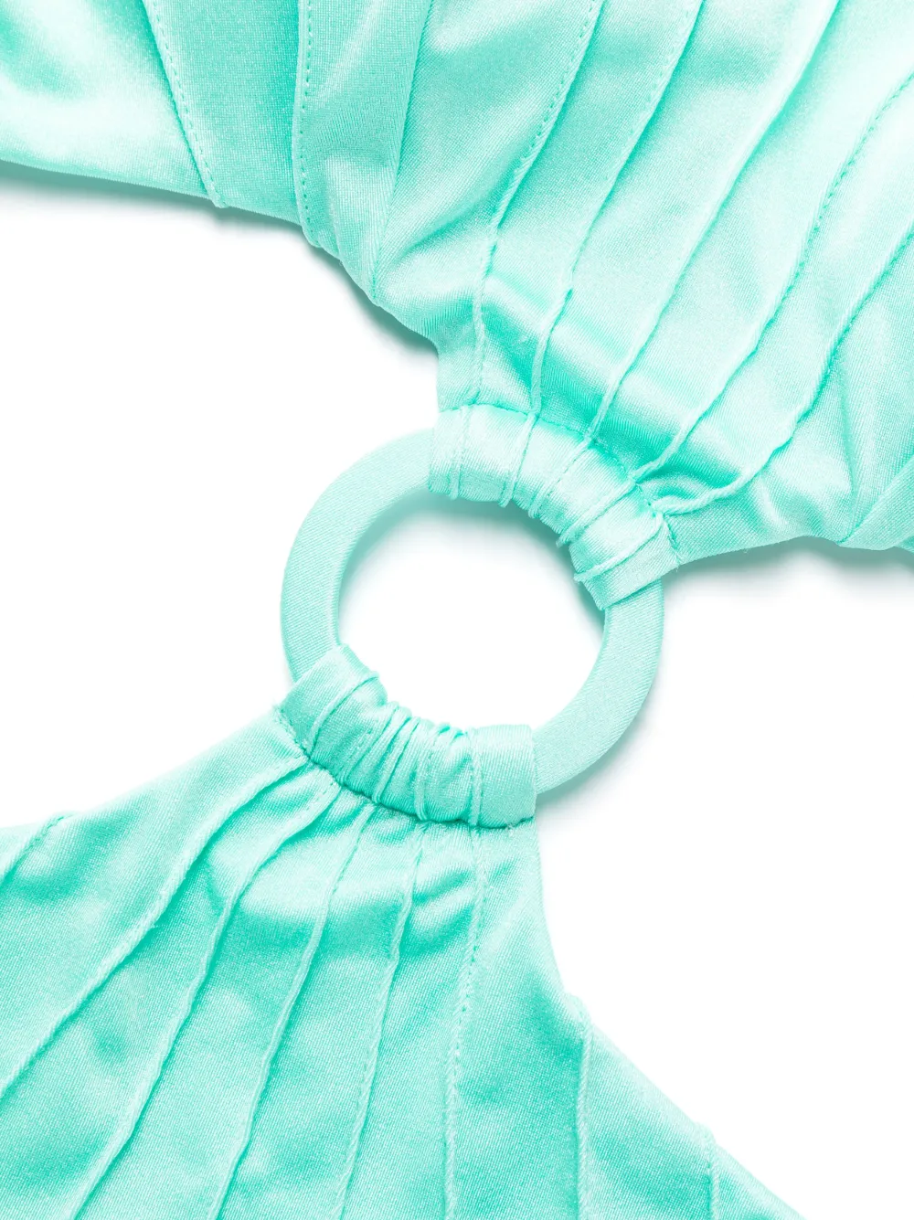 Бирюзовый, эластичный материал, вырезные детали, U-образный вырез, детали с оборками, металлические кольца и застежка на завязке сзади. Пожалуйста, примеряйте купальники и пляжные шорты только поверх собственного белья.