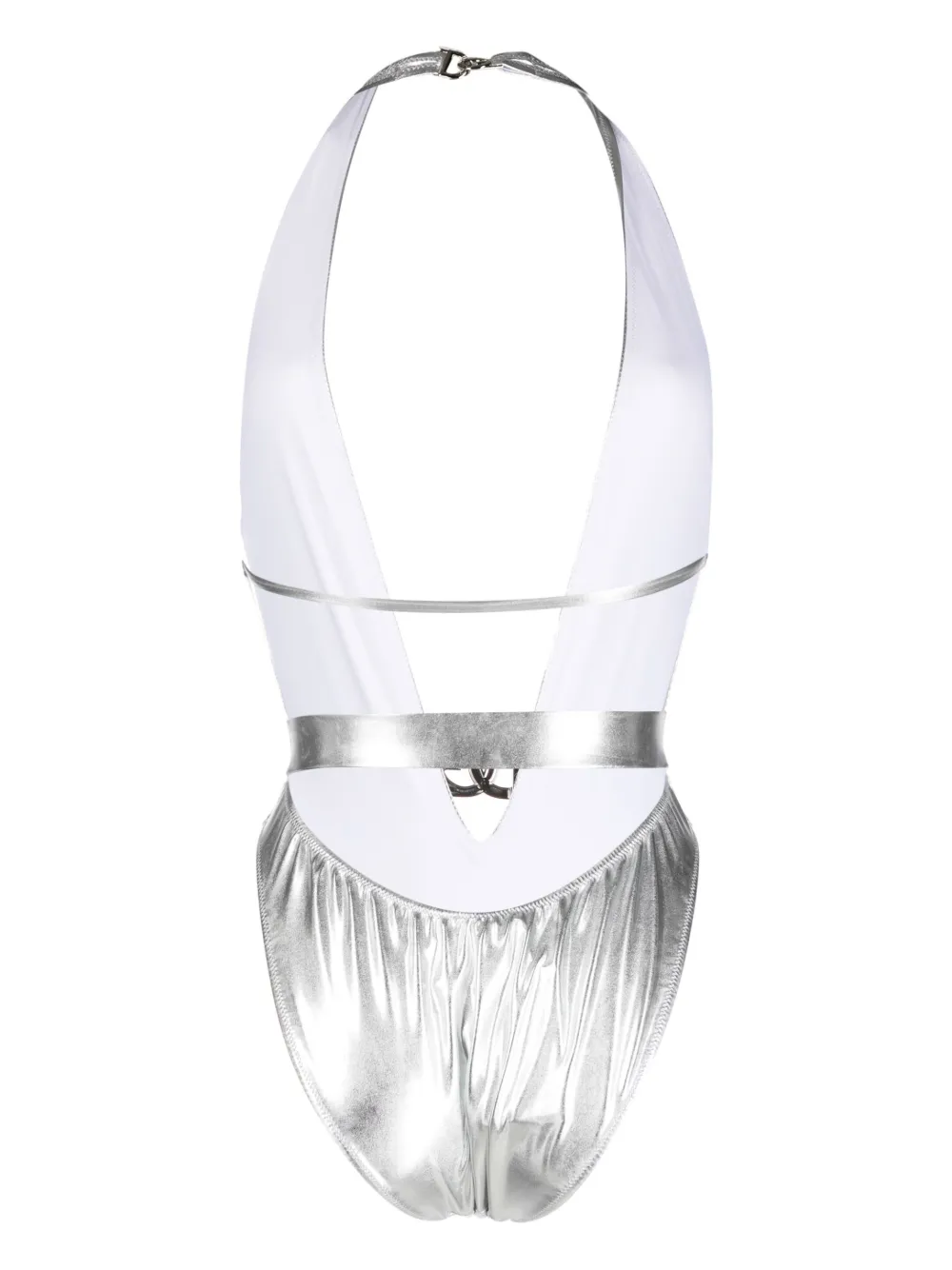 Серебристый, эластичный материал, серебристый металлический логотип, застежка на пряжке с логотипом, глубокий V-образный вырез, без рукавов и слитная модель. Пожалуйста, примеряйте купальники и пляжные шорты только поверх собственного белья.