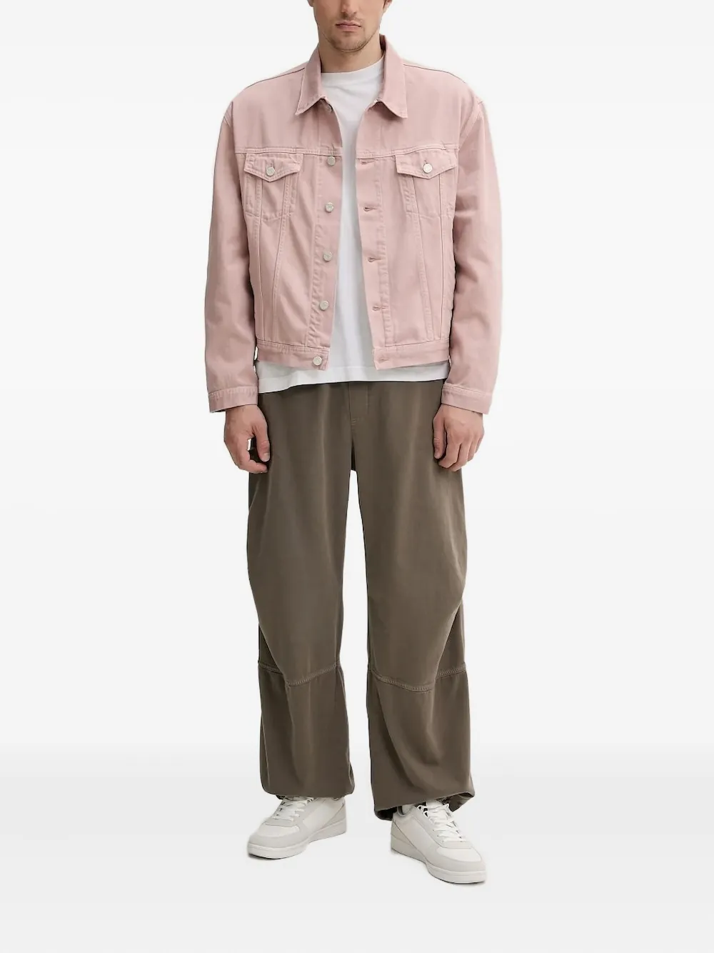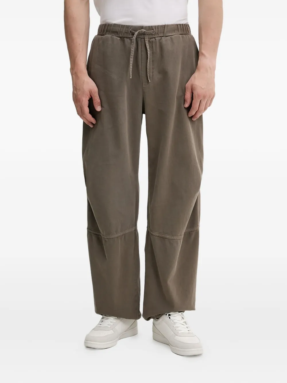 Серый эластичный пояс, затягивающийся на шнурок, два задних кармана, панельный дизайн, отделка строчкой