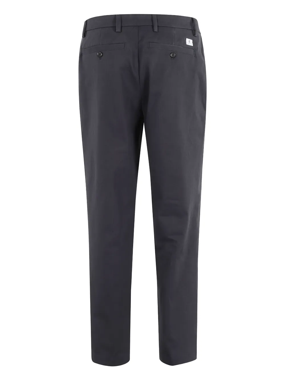 Синие плиссированные детали, застежка на пуговицы, шлевки для ремня, прорезные карманы.