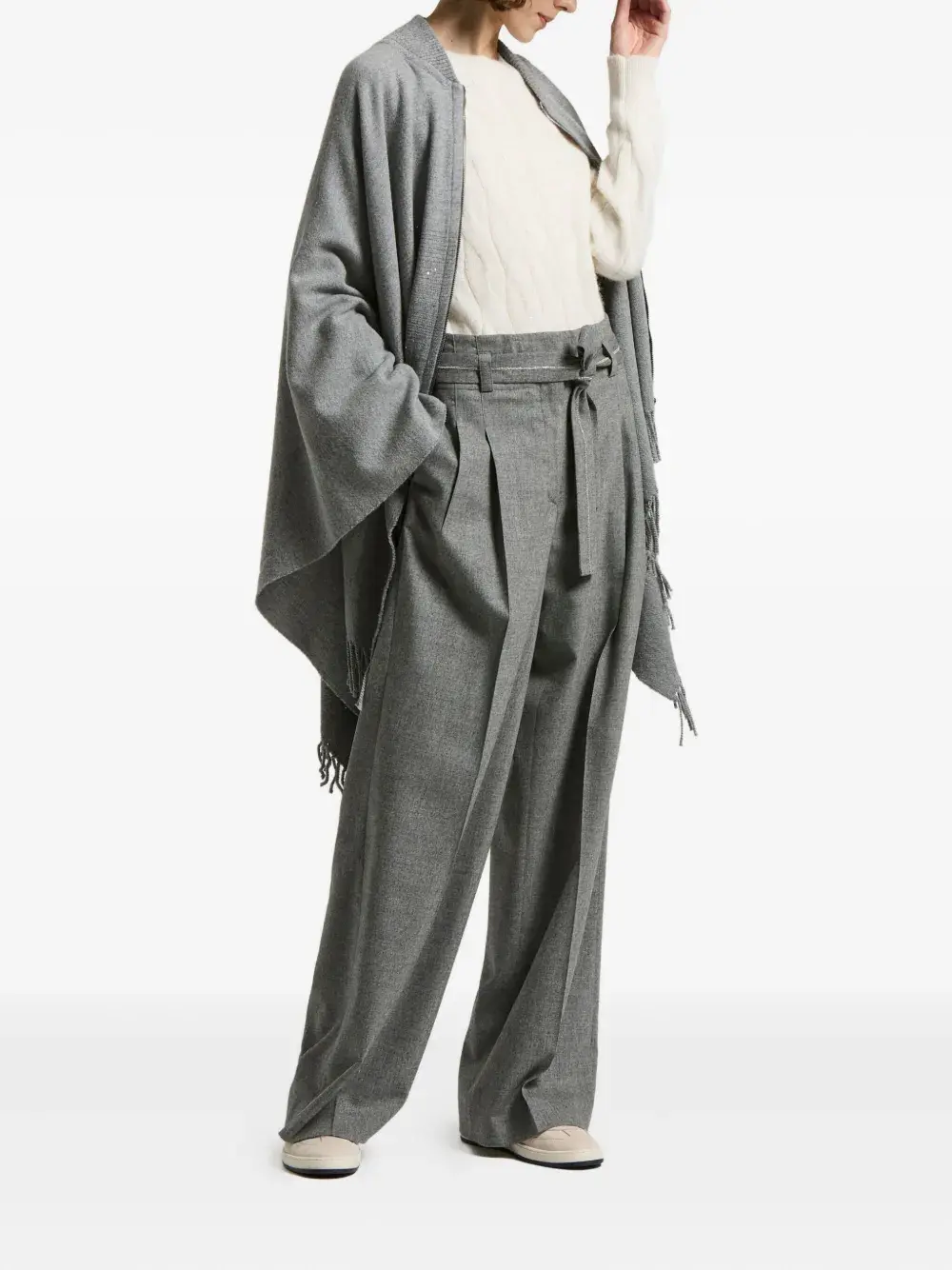 Серые плиссированные детали, завязывающийся пояс со шлевками
