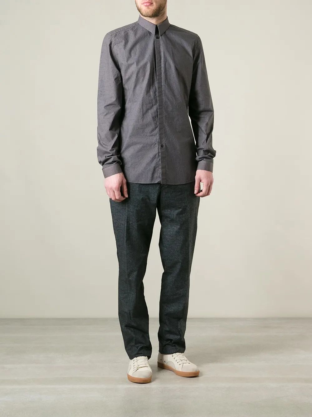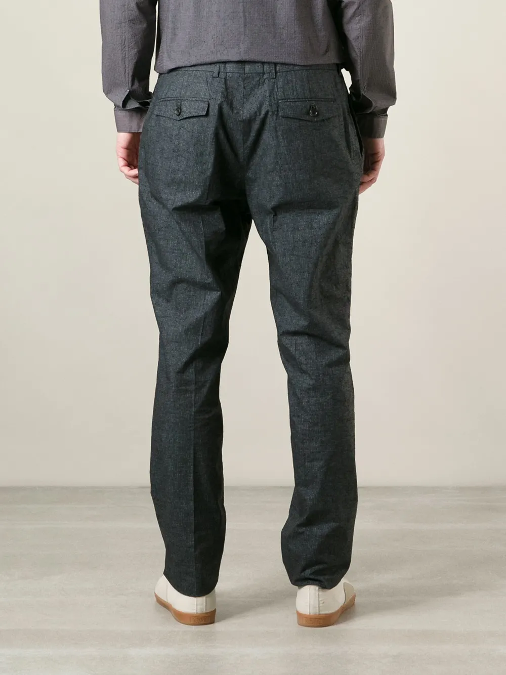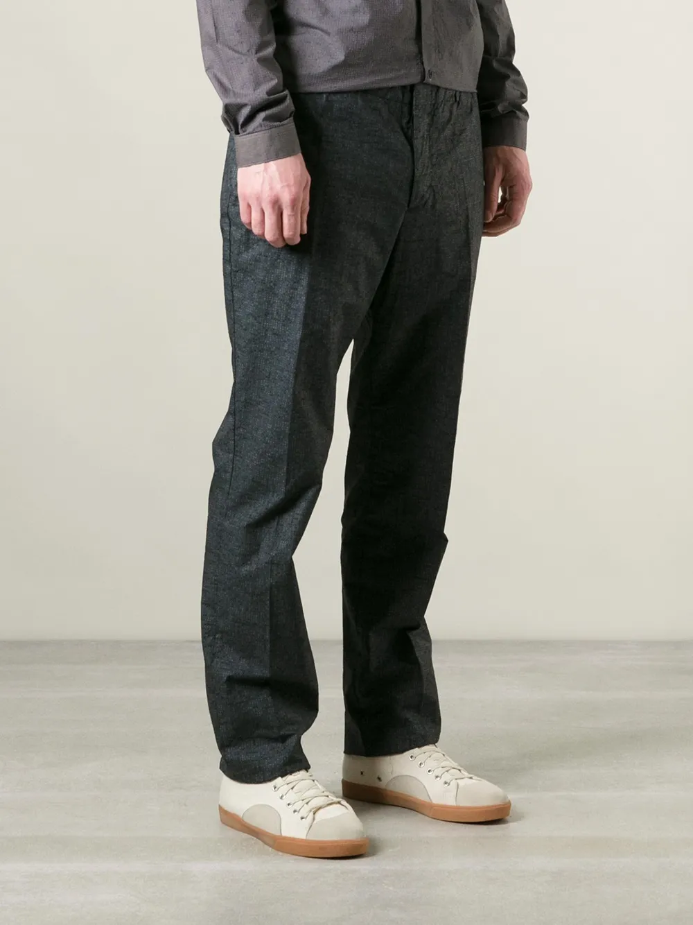 Темно-серые хлопковые зауженные брюки от Nicolas Andreas Taralis. Завышенная посадка, пояс с петлями для ремня, потайная застёжка спереди, боковые карманы, два задних прорезных кармана на пуговицах, прямые брючины, стандартная длина. Размер этой модели соответствует стандарту..
