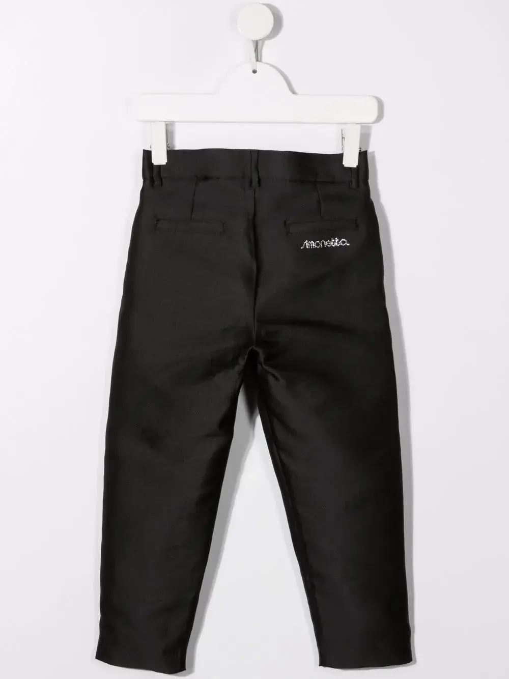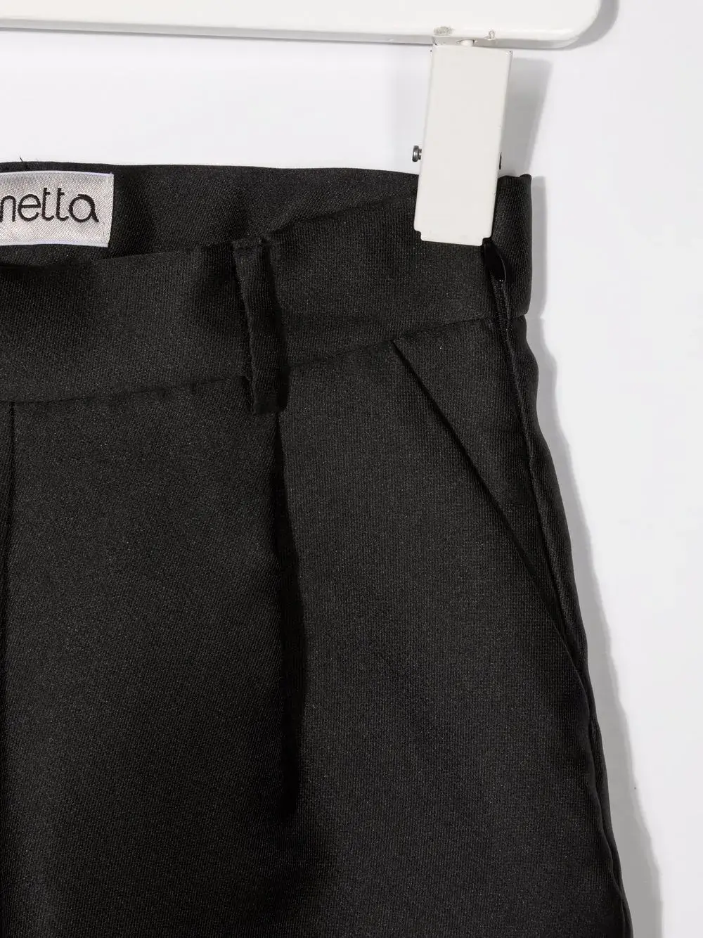 Средняя посадка, петли для ремня, застежка на молнии и пуговице спереди, два прорезных кармана по бокам и задние карманы с листочкой. Цвет: черный.