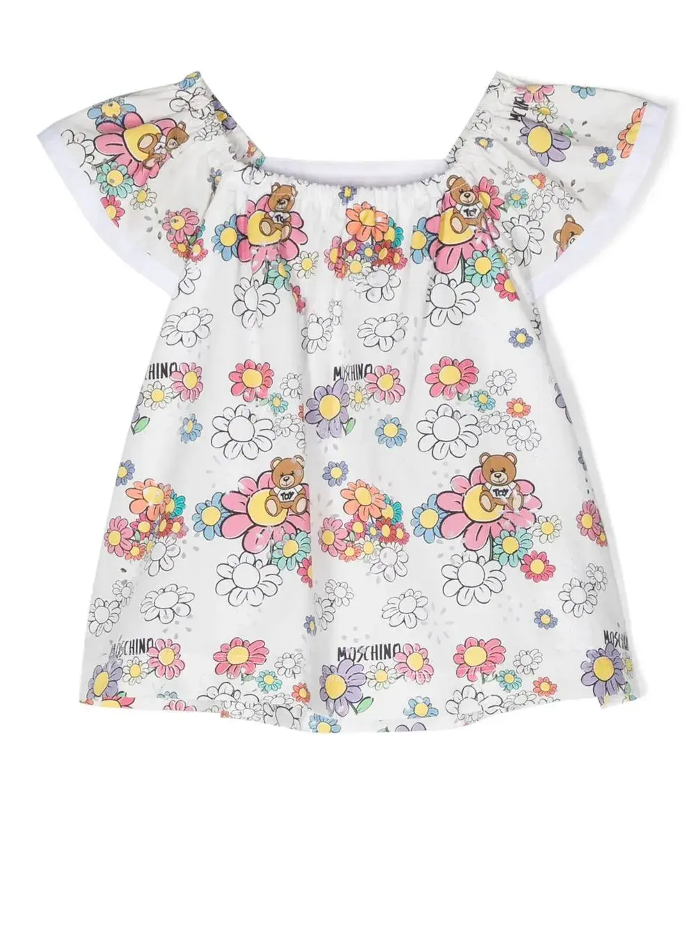 Белый/разноцветный, хлопок, принт с изображением плюшевого медведя, квадратный вырез, короткие рукава и прямой подол.