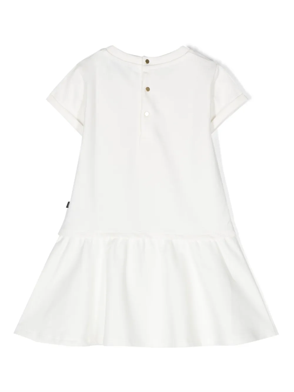 Молочно-белый, эластичный хлопок, принт с изображением плюшевого медведя, логотип спереди, круглый вырез, застежка на пуговицы сзади, короткие рукава и расклешенный крой.