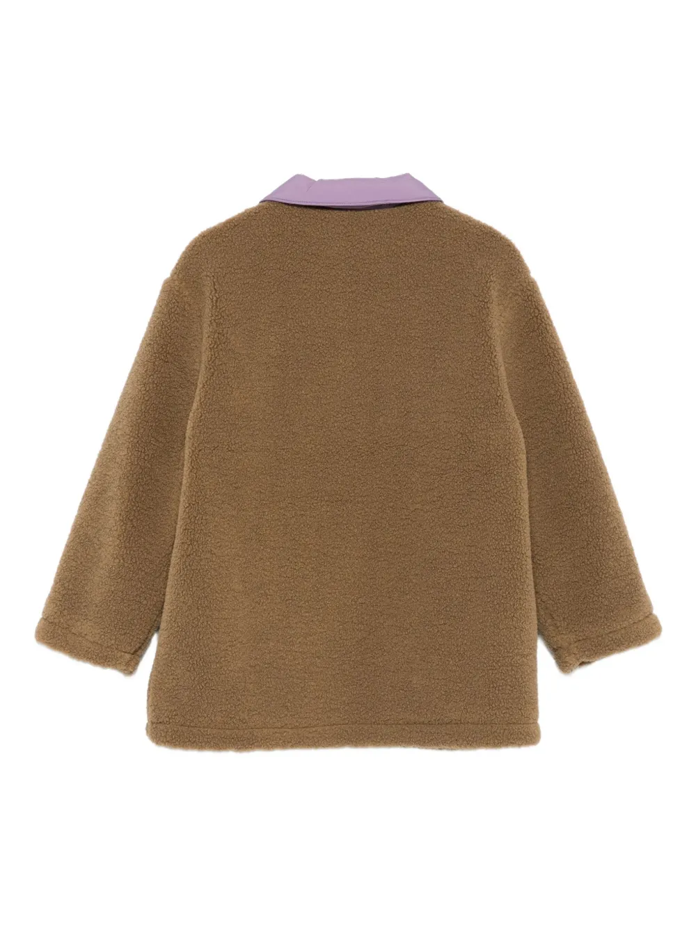 Бежевый плюшевый мишка с контрастной текстурой, застежка на пуговицы, воротник, длинные рукава.