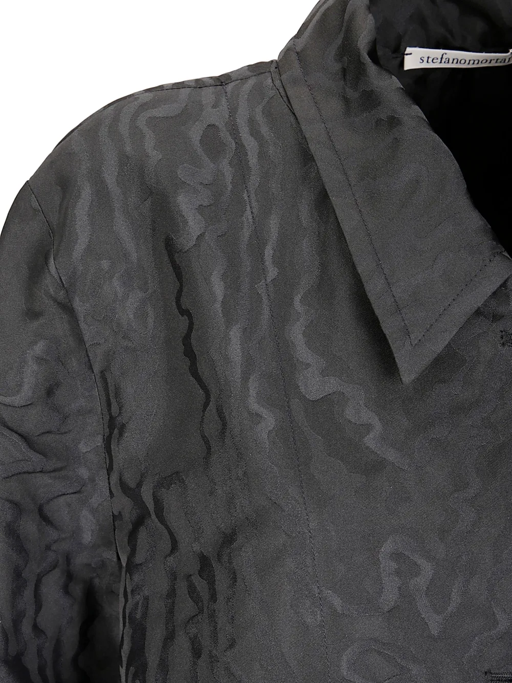 Черная текстурированная ткань, застежка на пуговицы, воротник, длинные рукава.
