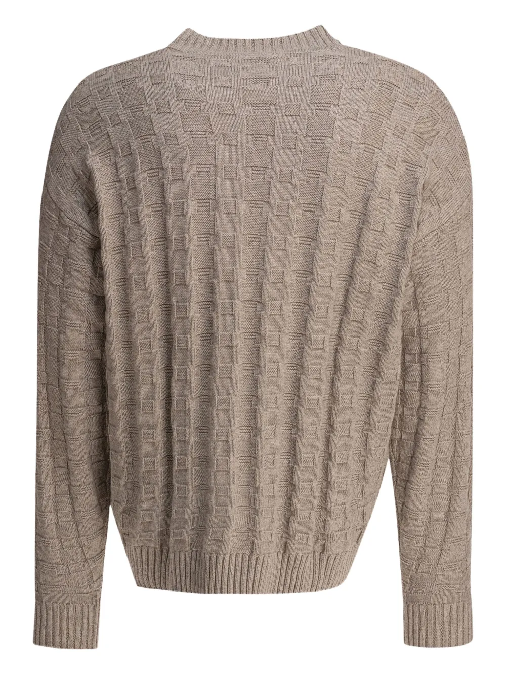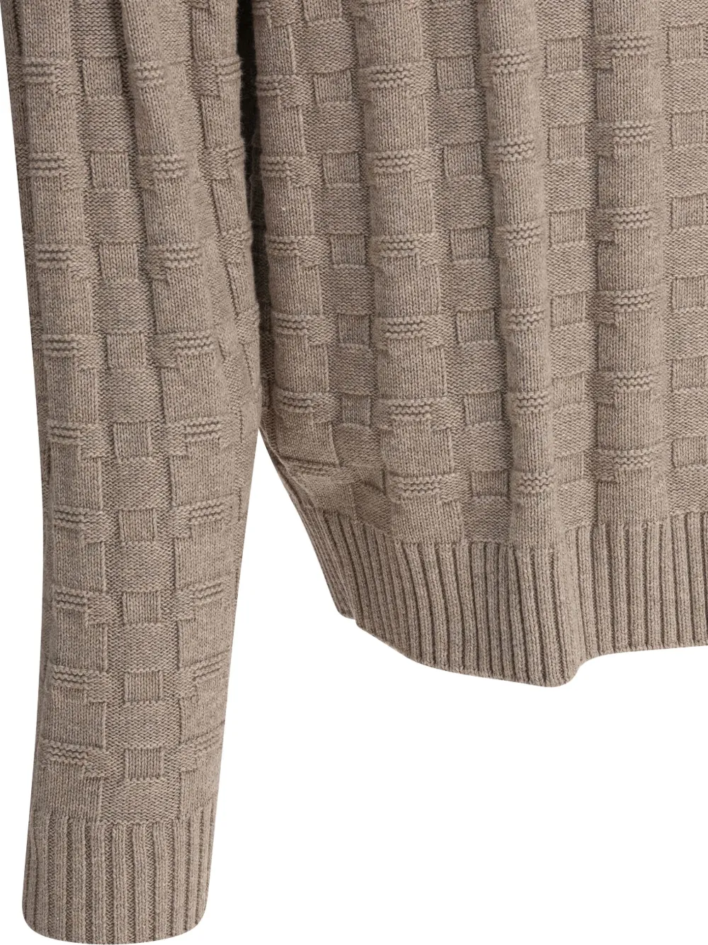 Бежевый текстурированный трикотаж с круглым вырезом, длинными рукавами, ребристым подолом.