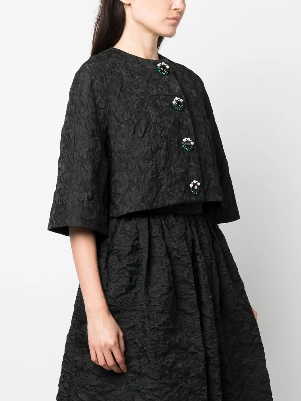 Черный, шелк, фактурная отделка, декор из кристаллов, детали с жемчугом, круглый вырез, застежка на пуговицах спереди, рукава по локоть, укороченная длина и прямой подол.