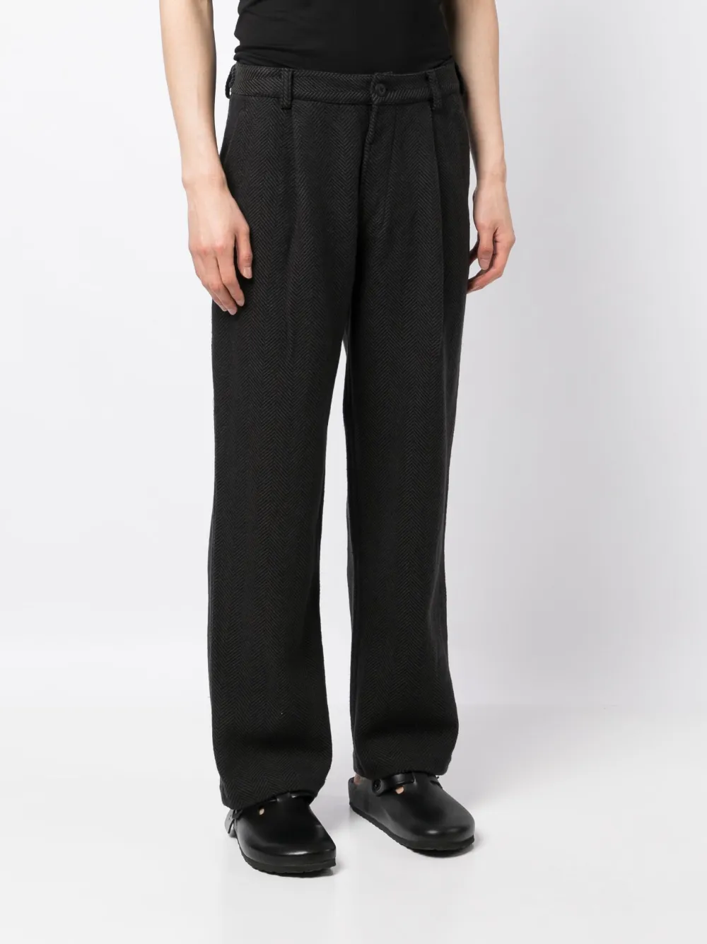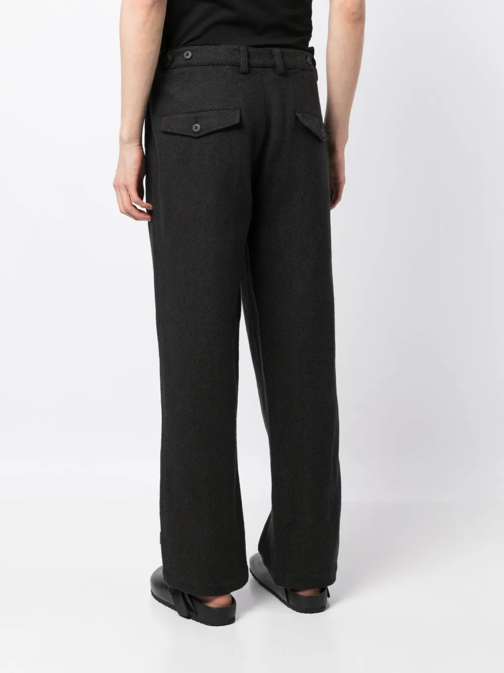 Черный, хлопок, фактурная отделка, петли для ремня, складки, ширинка на пуговицах, два кармана по бокам и два кармана с клапанами сзади.