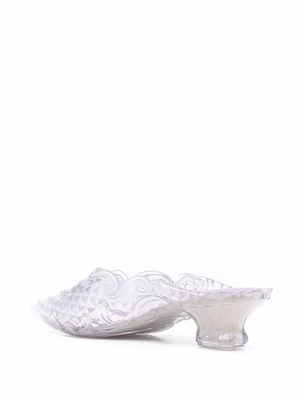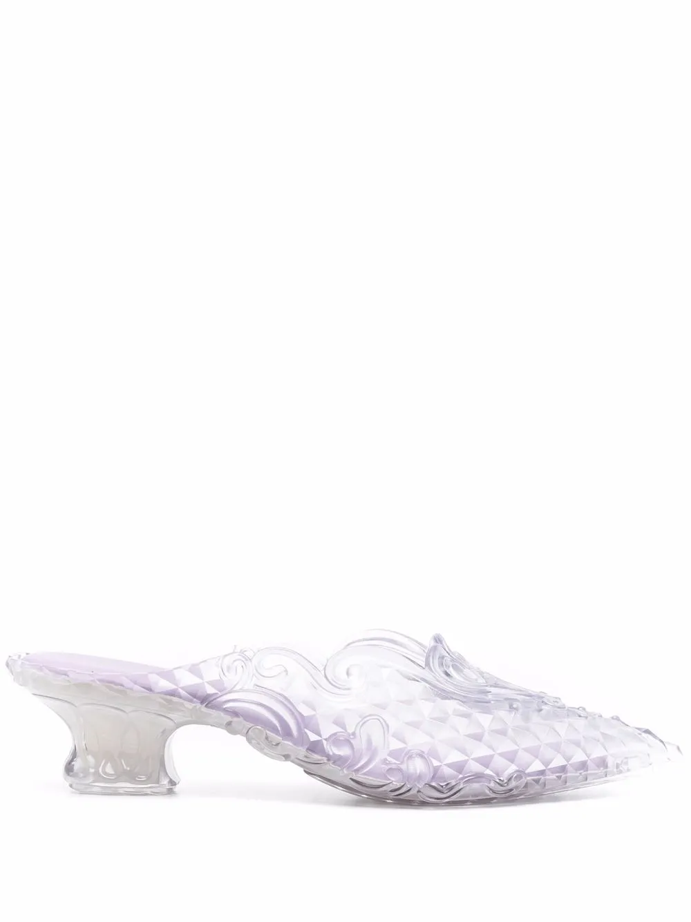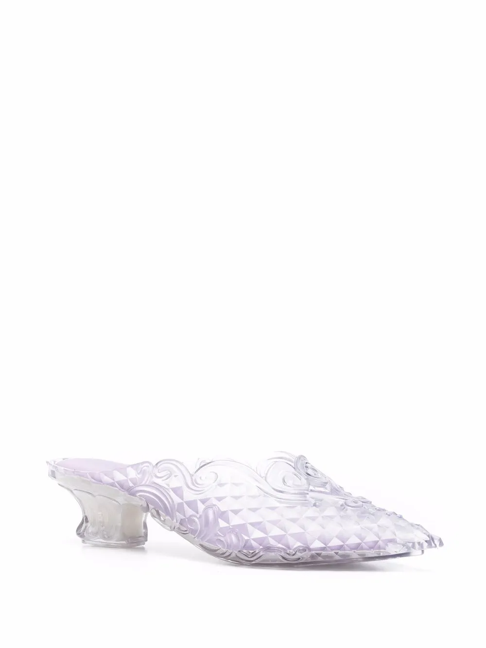 Заостренный носок, фактурная отделка, модель без застежки и низкий каблук в форме конуса.