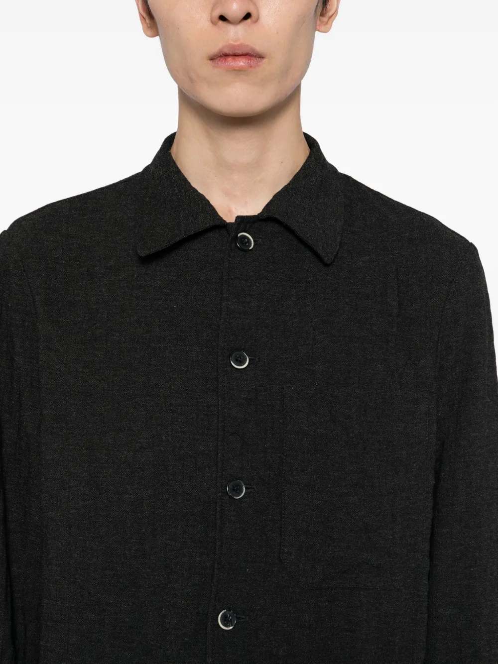 Черная застежка на пуговицы спереди, длинные рукава, манжеты на пуговицах, нагрудный накладной карман
