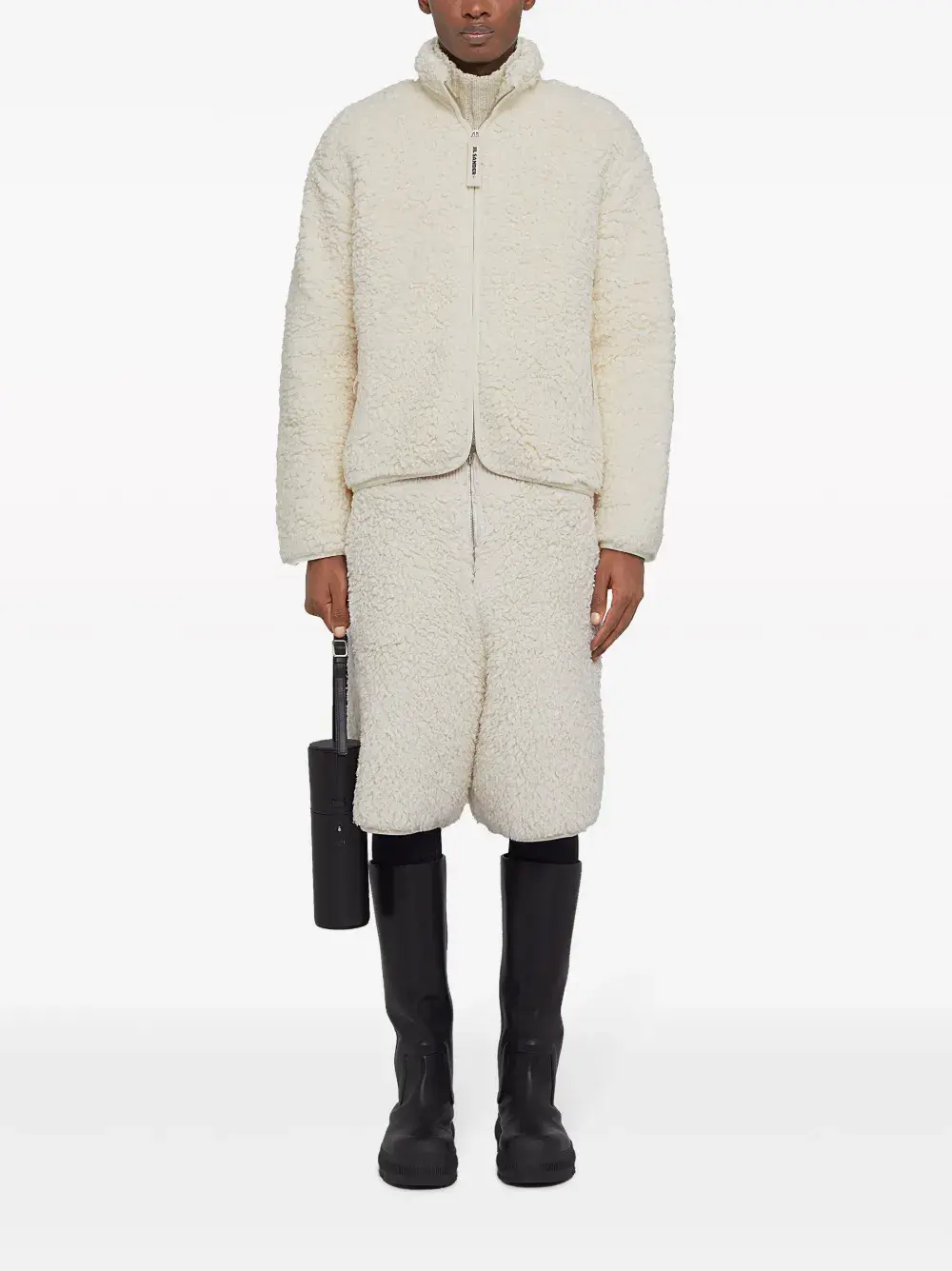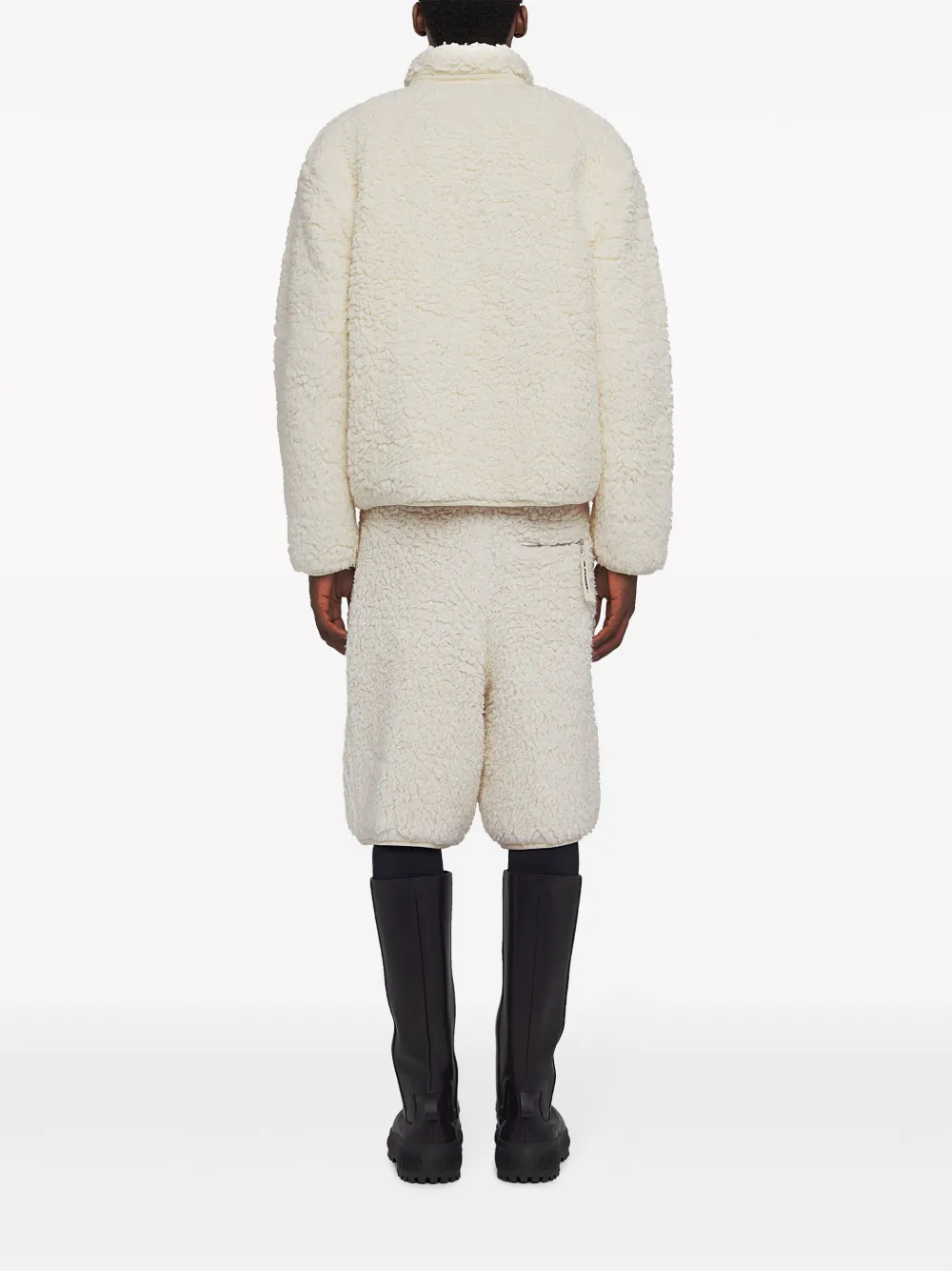Белый, хлопок, отделка из шерпы, фактурная отделка, пояс в рубчик, застежка на молнии спереди, два вшитых кармана по бокам, карман на молнии сзади и прямой подол.