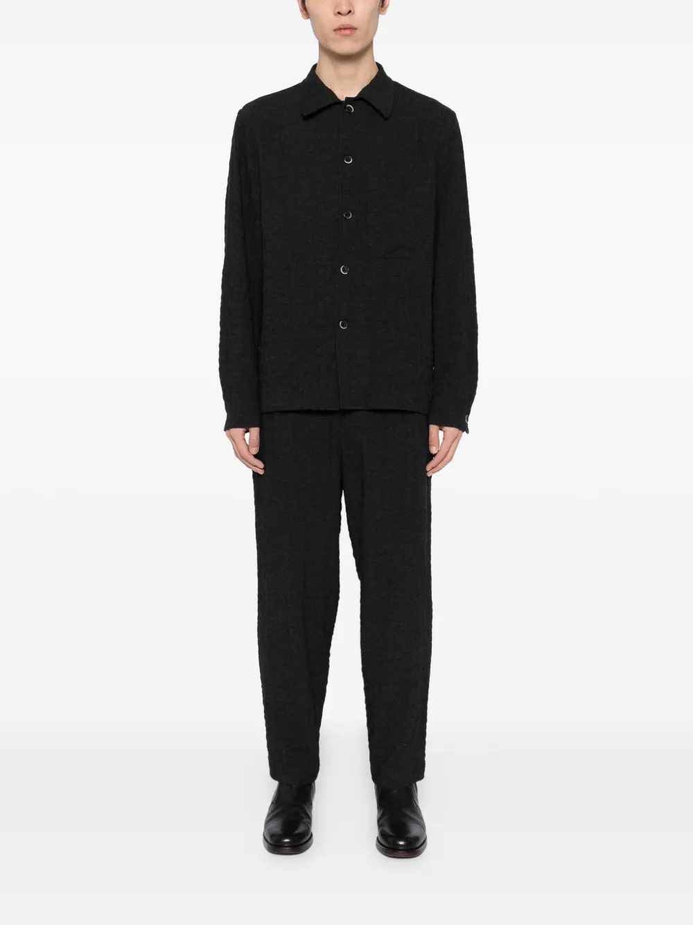 Черная застежка на пуговицы и молнию спереди, два прорезных кармана спереди, два прорезных кармана сзади на пуговицах, эластичный пояс