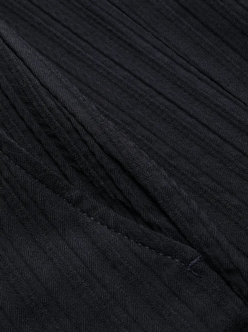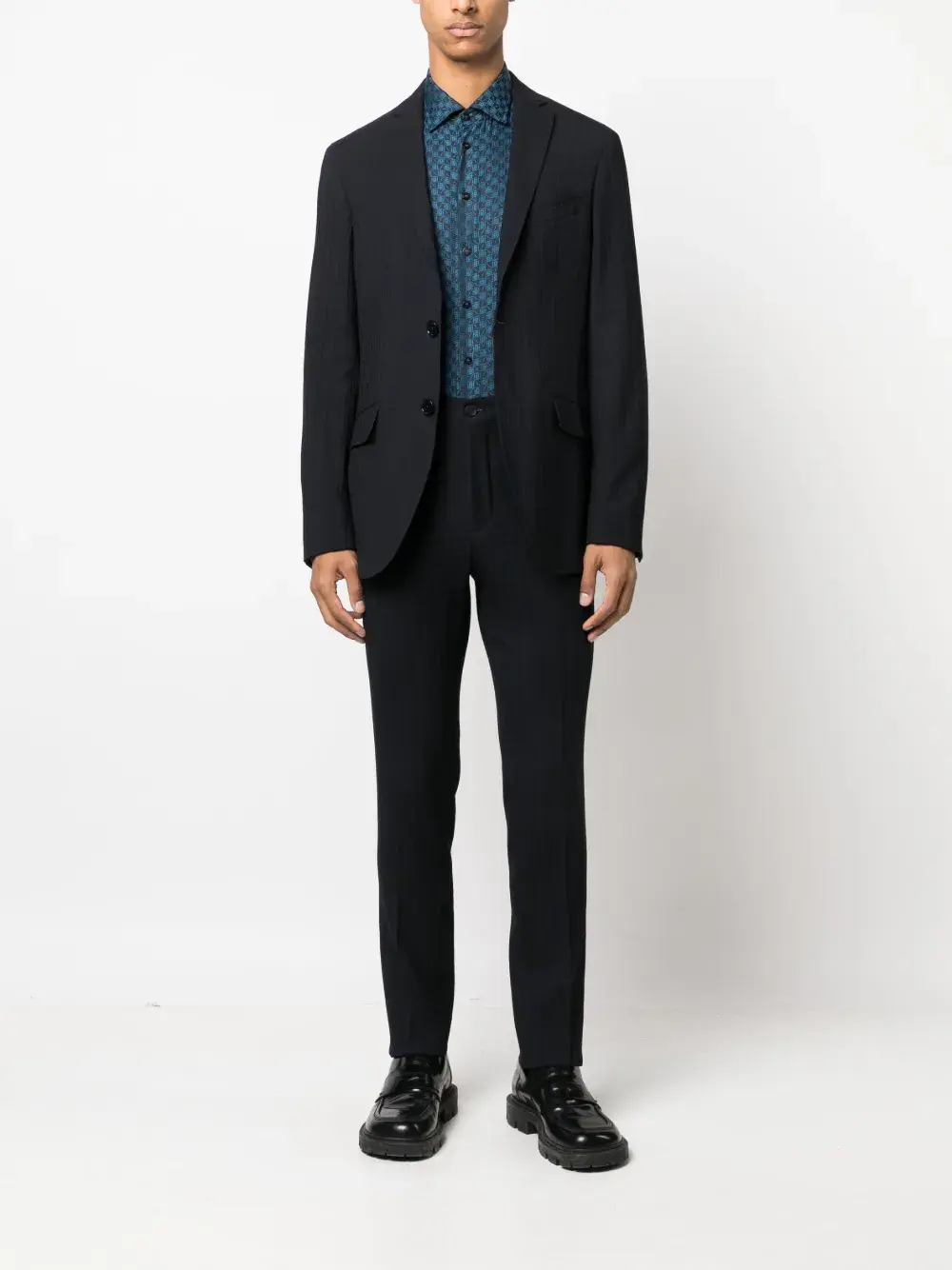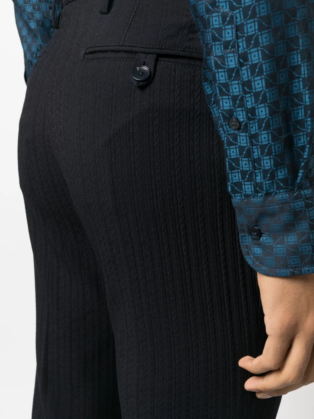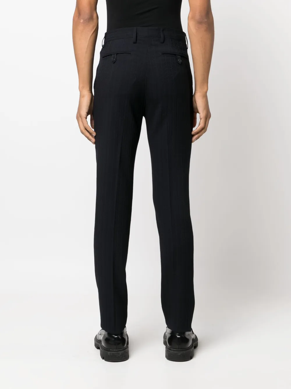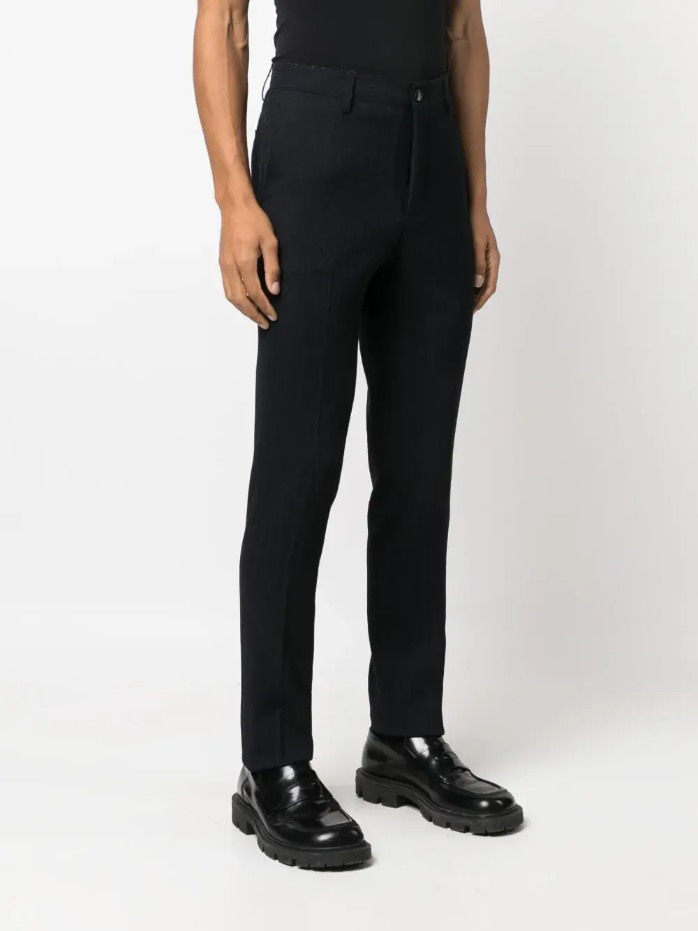 Темно-синий, смесь шелка и вирджинской шерсти, фактурная отделка, строгий крой, средняя посадка, узкий крой, петли для ремня, два прорезных кармана на пуговицах сзади и застежка на молнии и пуговице спереди.