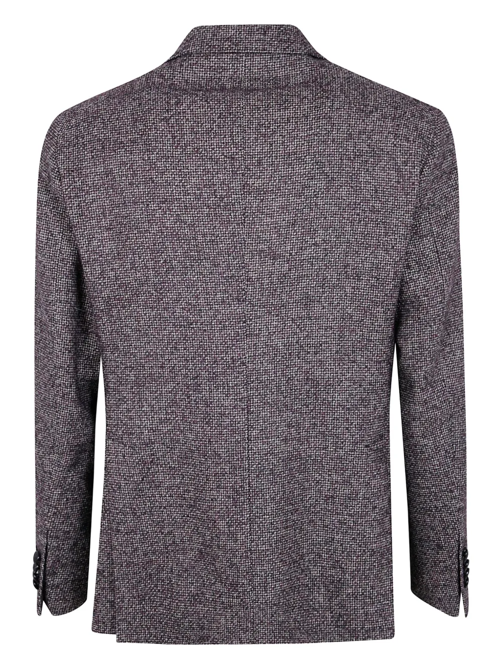 Черная шерстяная ткань, застежка на две пуговицы, пестрый узор, зазубренные лацканы, однобортный.
