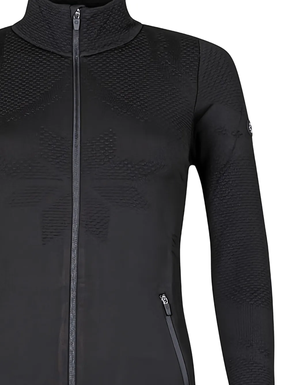Черный текстурированный трикотаж, высокий ворот, застежка-молния по всей длине, два кармана на молнии, длинные рукава