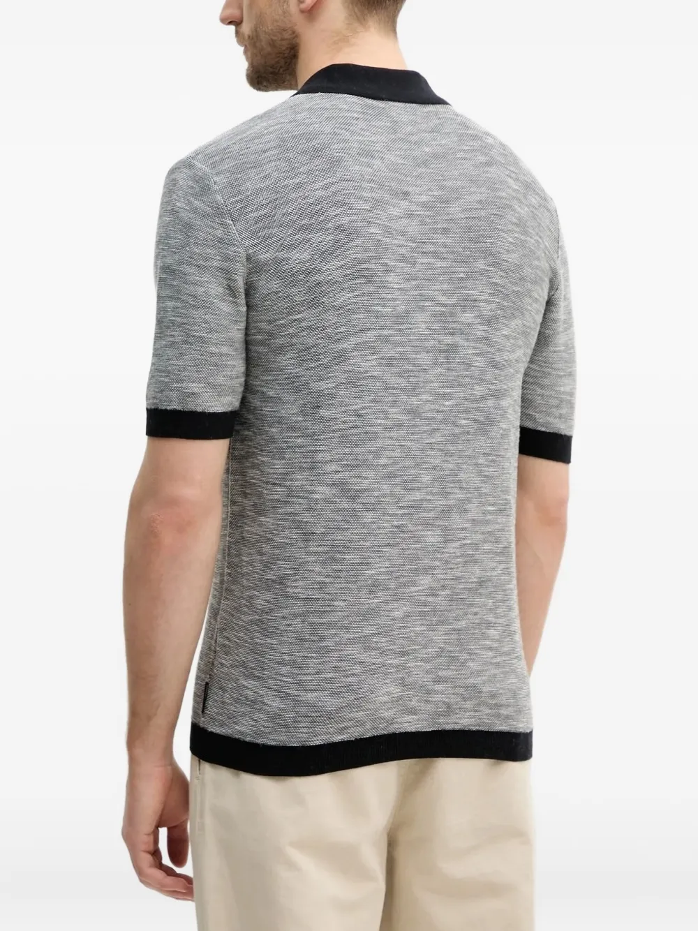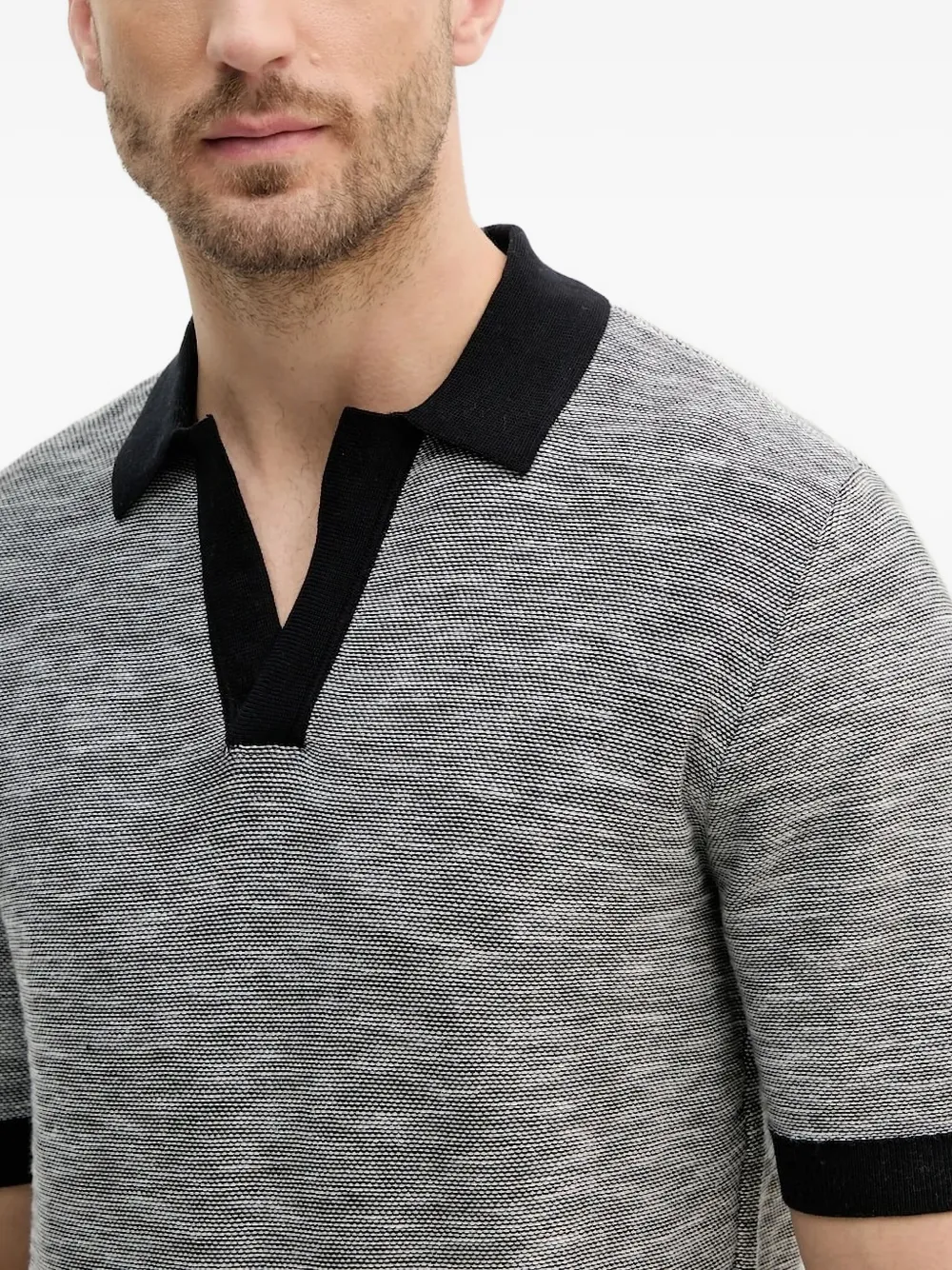Темно-синяя рубашка с короткими рукавами, V-образным вырезом, черной отделкой и воротником-поло.