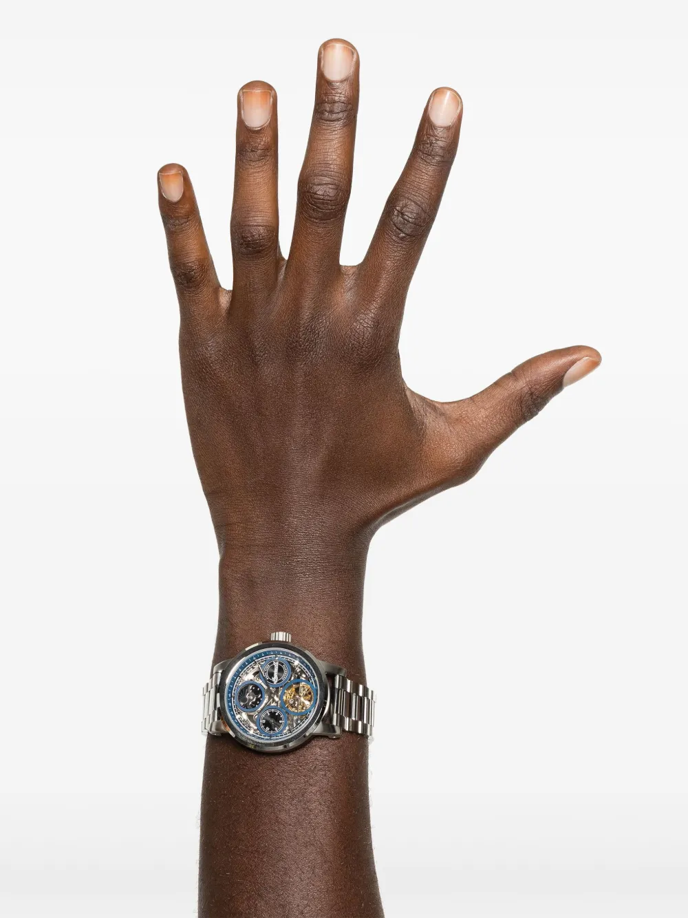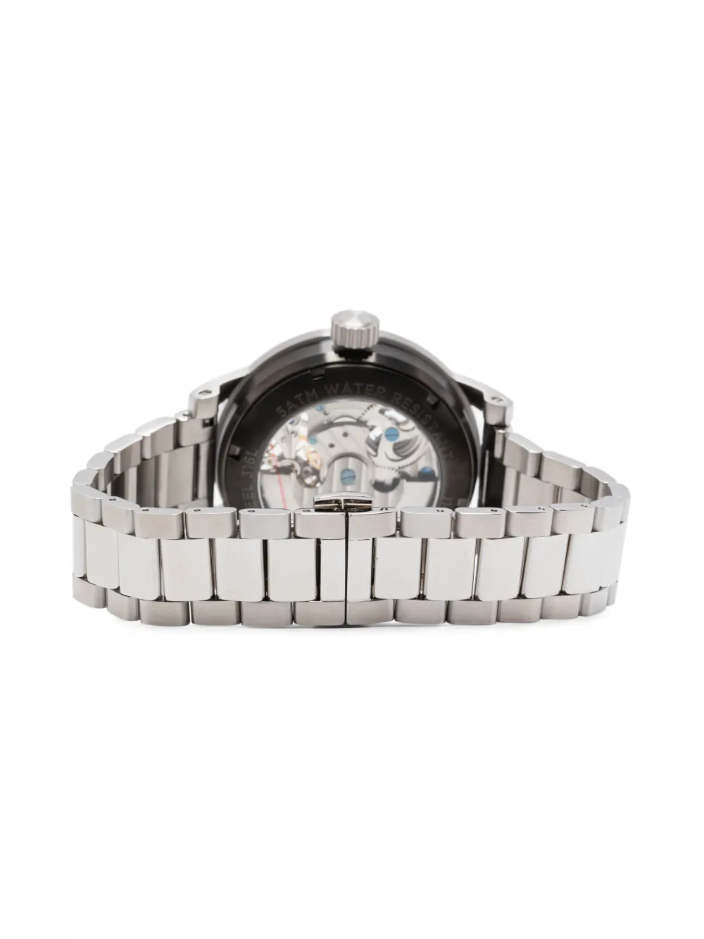 Подробнее о товаре: • 44 мм • серебристый • нержавеющая сталь • устойчивое к царапинам минеральное стекло • круглый корпус • прозрачный циферблат • мечевидные стрелки • дополнительный циферблат с секундной стрелкой • отображение времени в двух часовых поясах • хронограф • автоматический механизм • завинчивающаяся заводная коронка • скелетированная задняя крышка • регулируемый браслет • раскладывающаяся застежка с кнопкой • водонепроницаемость до 50 метров/5 АТМ