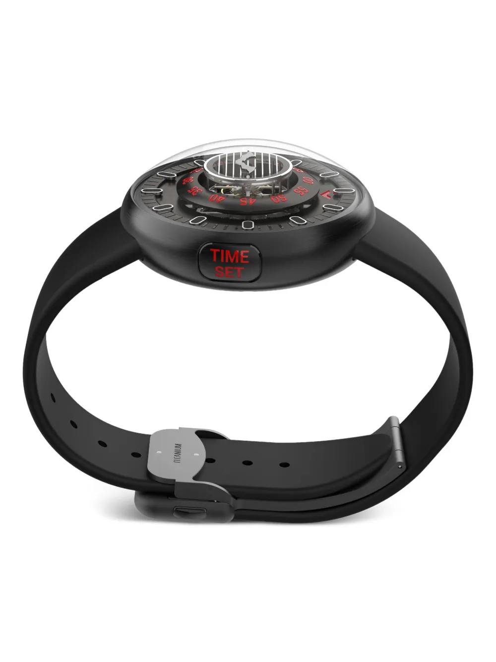 Круглый корпус из черного титана диаметром 45 мм, геометрический циферблат, центральный турбийон, стрелки в форме крыльев летучей мыши, часовые метки с покрытием Super-LumiNova, кожаный ремешок, механизм калибра KS 7'001, водонепроницаемость 3 АТМ/30 м.