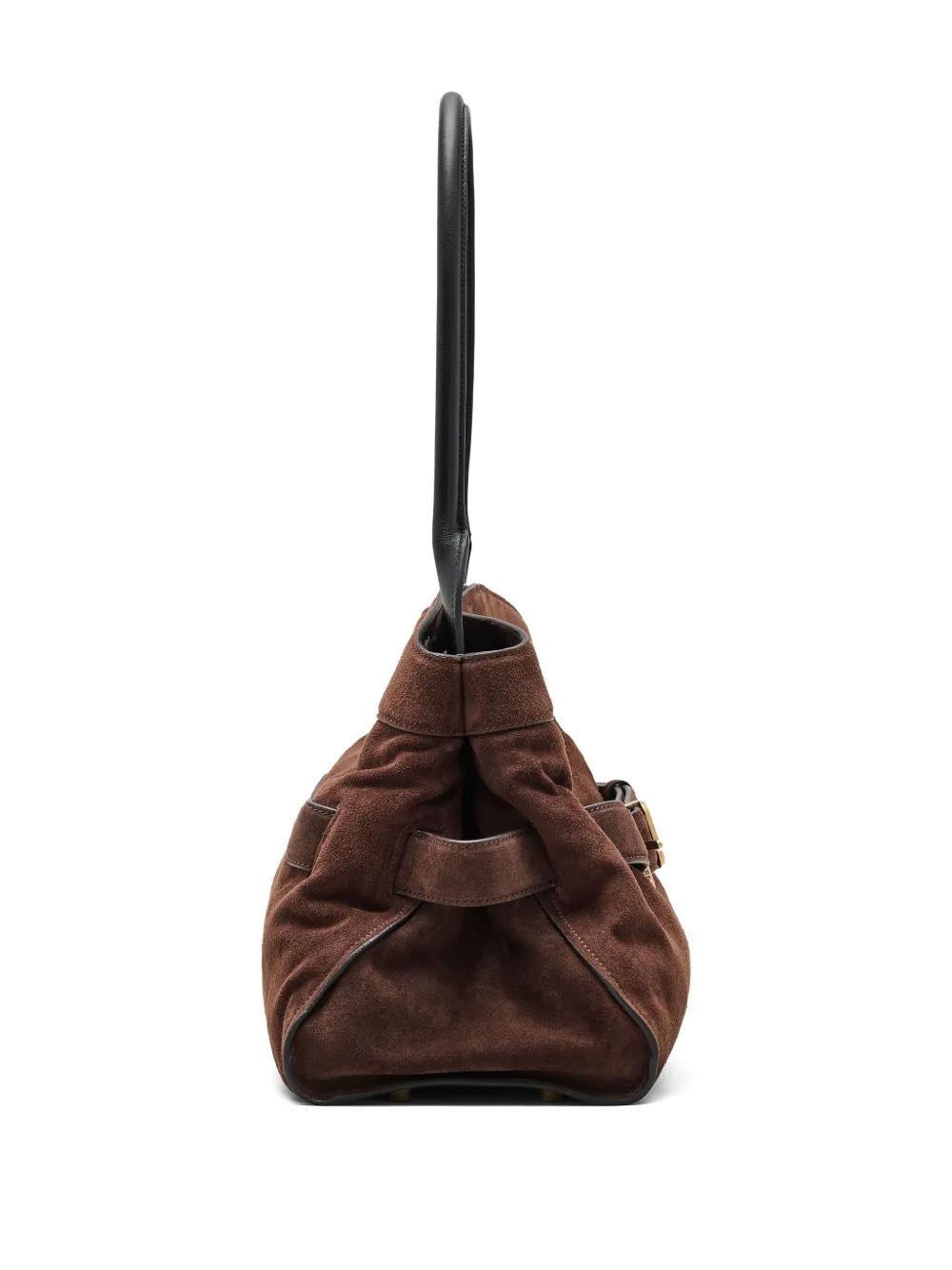 Темно-коричневая замшевая текстура, застежка на пряжку, верхние ручки, изогнутый силуэт, свободная форма.