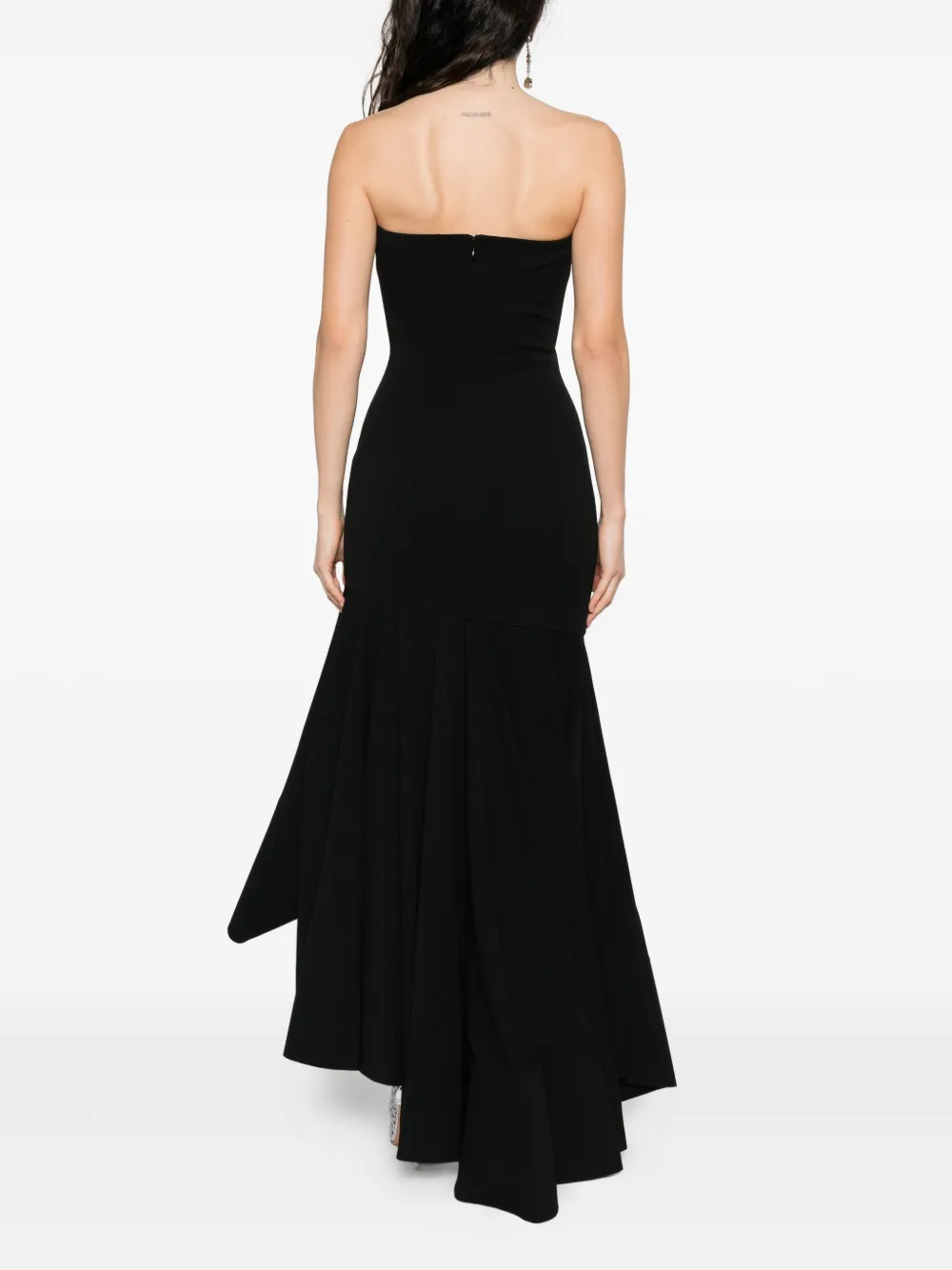 Черный без бретелек, асимметричный лиф с оборками и приталенным подолом.