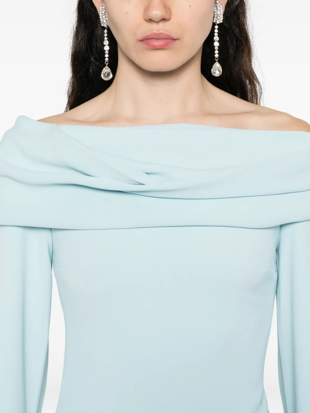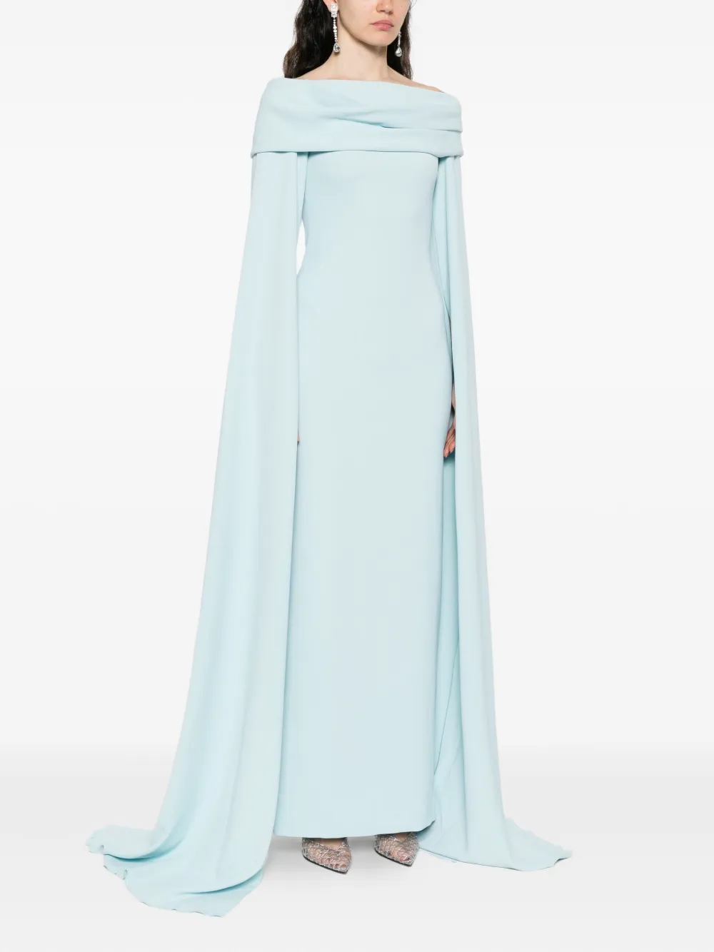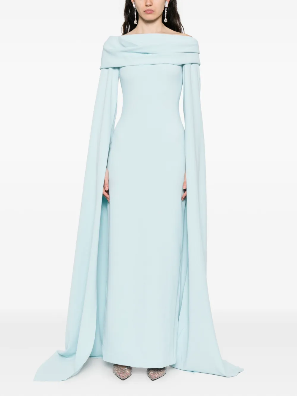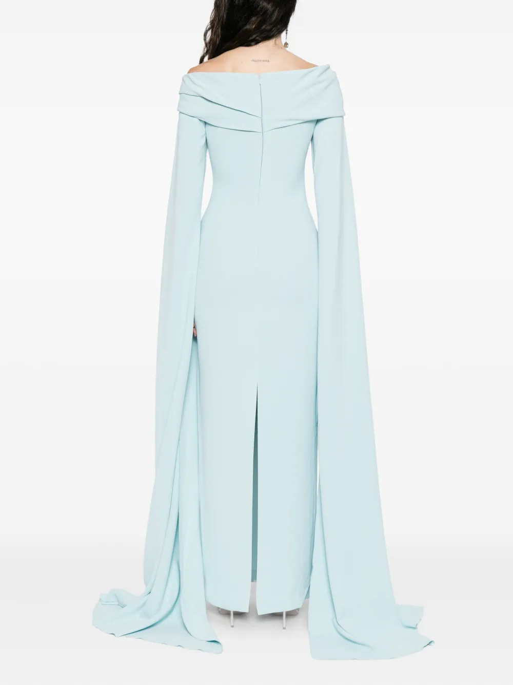Арктический синий, вырез с открытыми плечами, длинные рукава, облегающий лиф, рукава-накидка