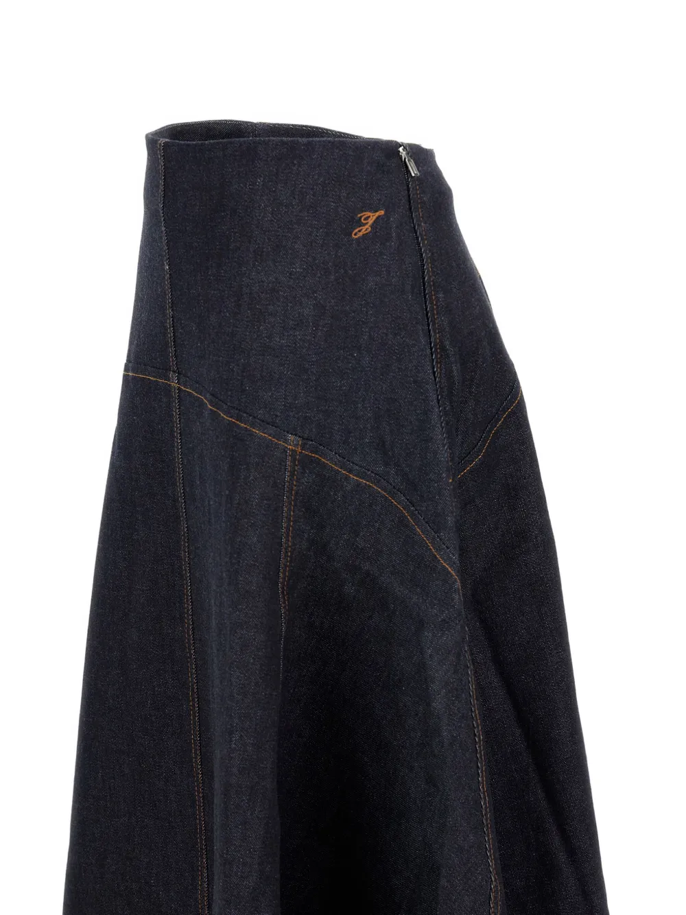 Расклешенный фасон синего цвета, контрастная строчка, застежка-молния, вышитая деталь