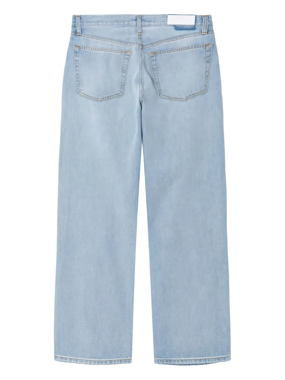 Светло-голубой с высокой талией, пятью карманами и пуговицами.