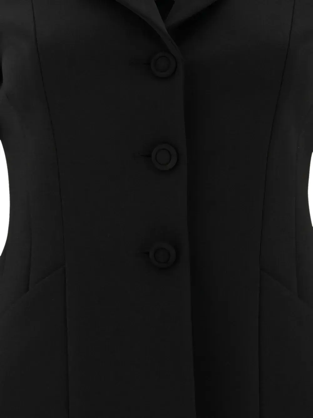 Черный пиджак с заостренными лацканами, тремя пуговицами, длинными рукавами, приталенным силуэтом, боковыми карманами.